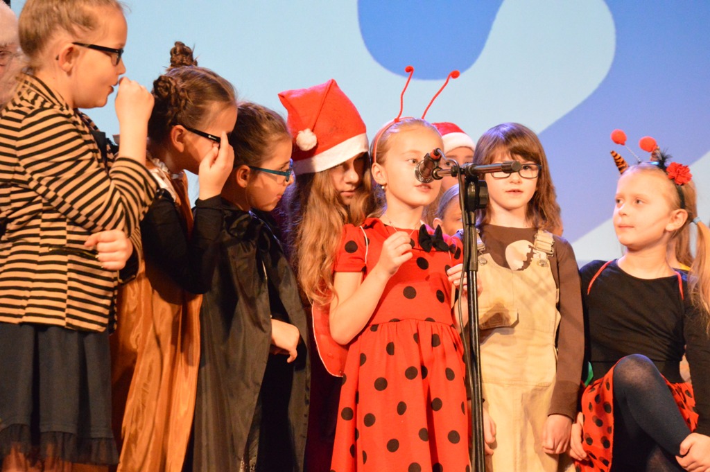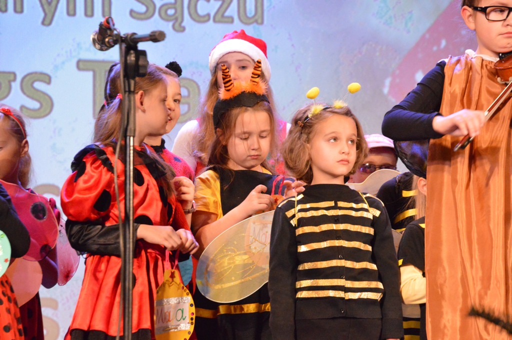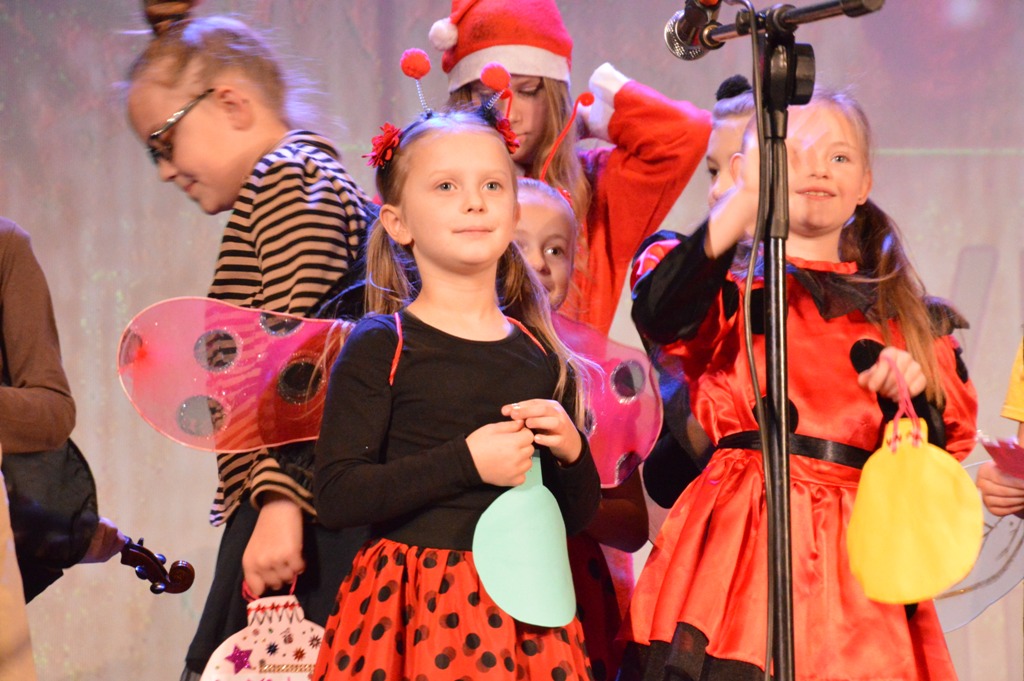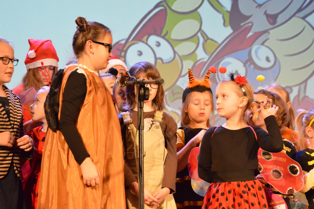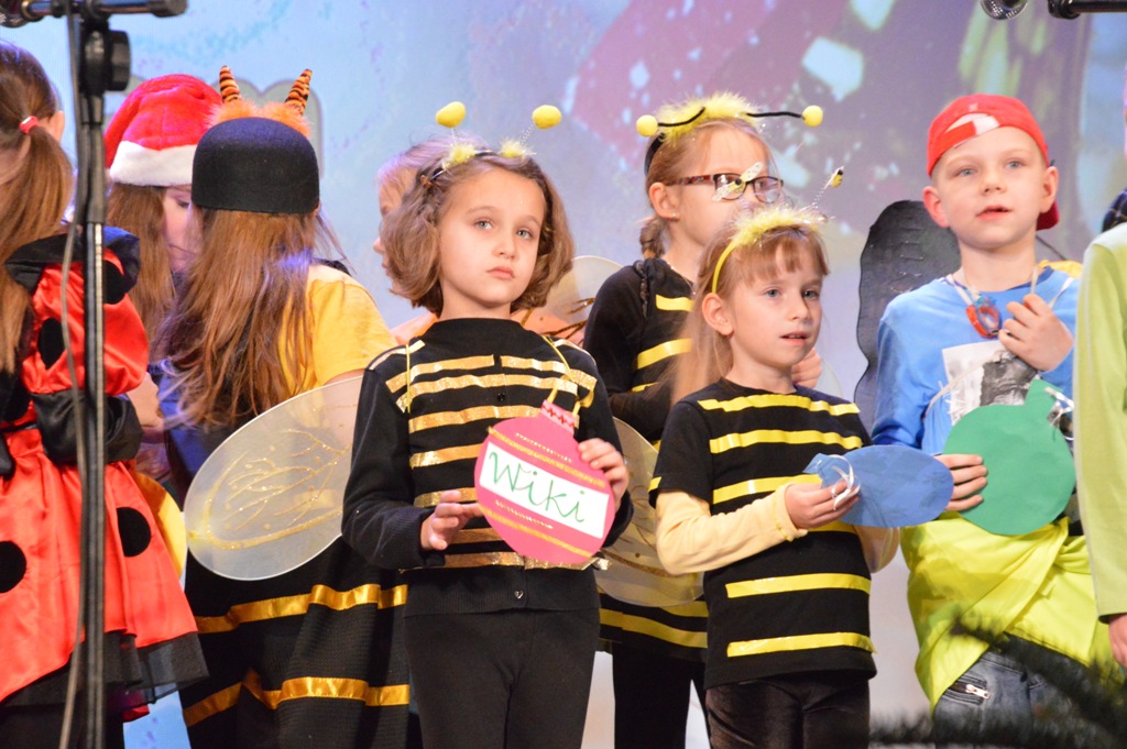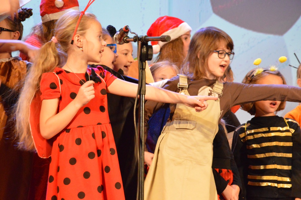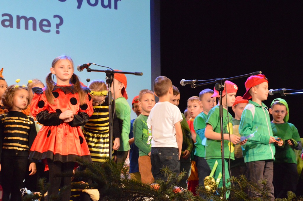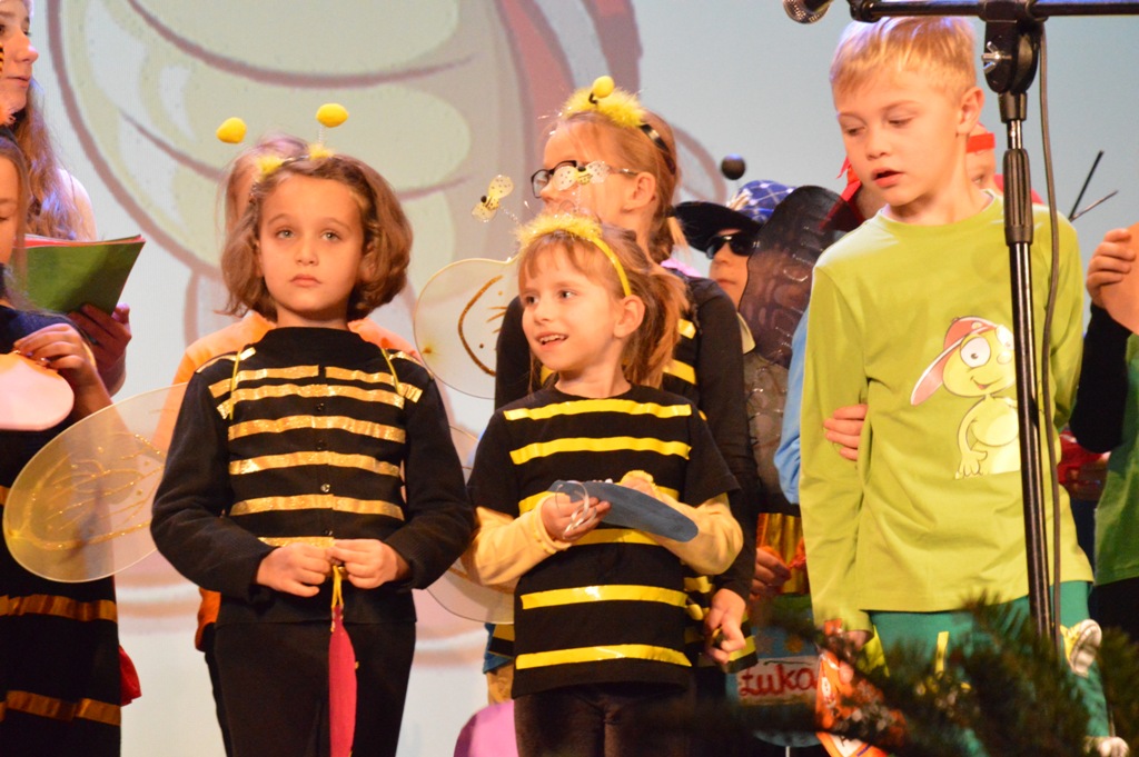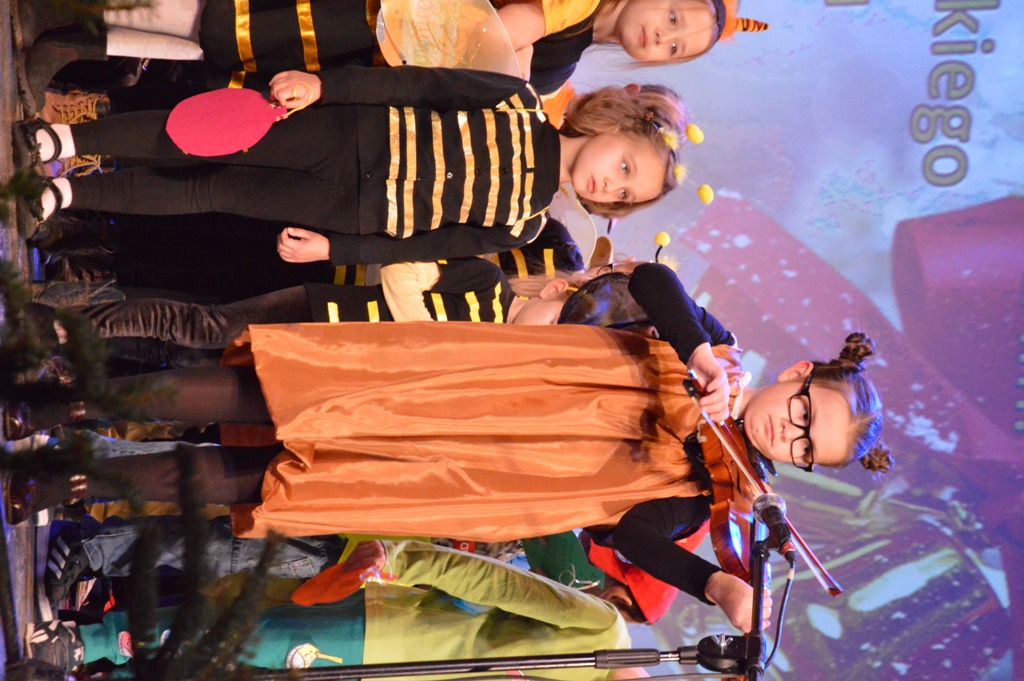 Na scenie wykreowano prawdziwą łąkę, na której pojawiły się biedronki, pszczółki, gąsienice, świetliki i chrząszcze. O grudniowej aurze i zbliżającym się świętym Mikołaju przypominały jedynie choinki i jodłowe gałązki, oraz magiczne dźwięki Jingle Bells płynące ze skrzypiec, którymi Emilka Nalepa z klasy 1a zaczarowała wielobarwną łąkę, dzięki czemu przenieśliśmy się w zimową krainę, czyli Winter Wonderland.