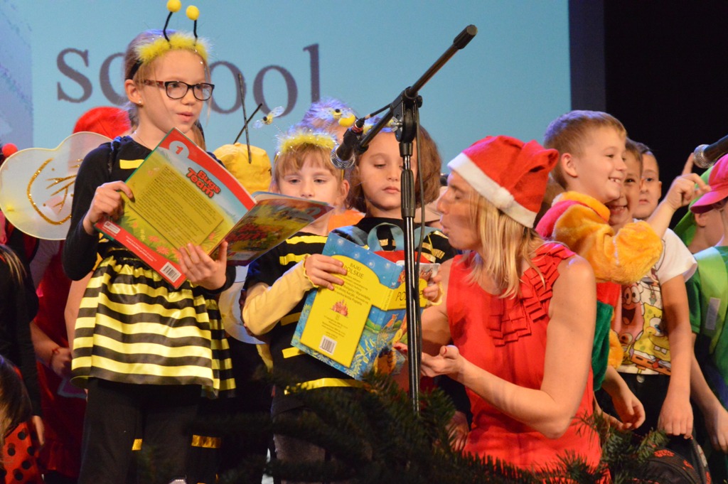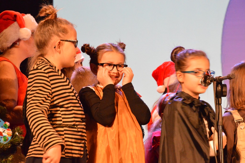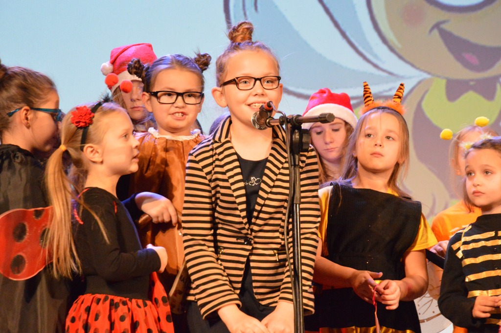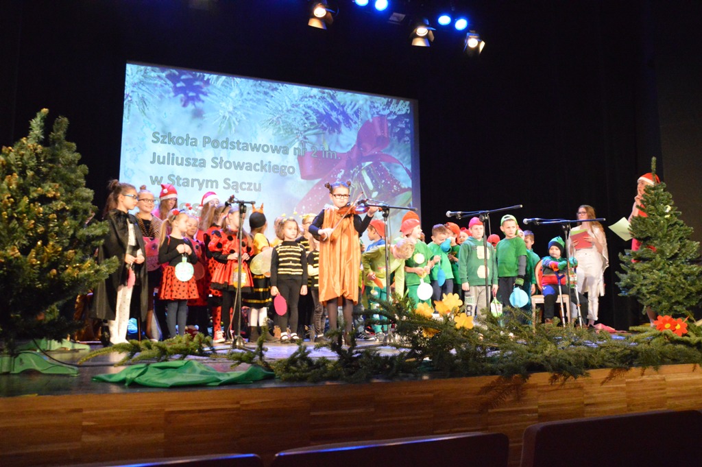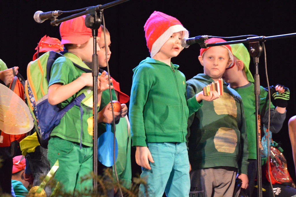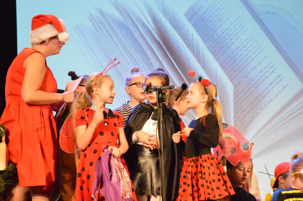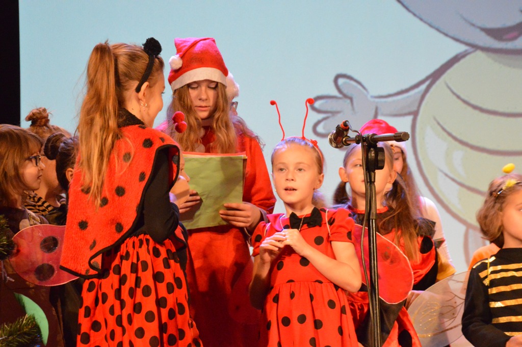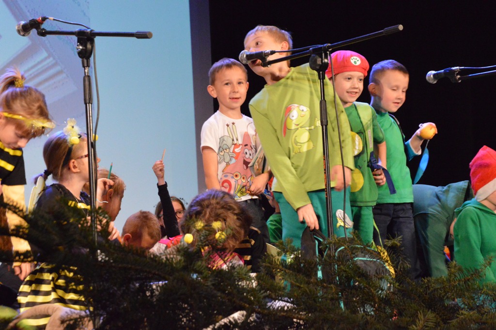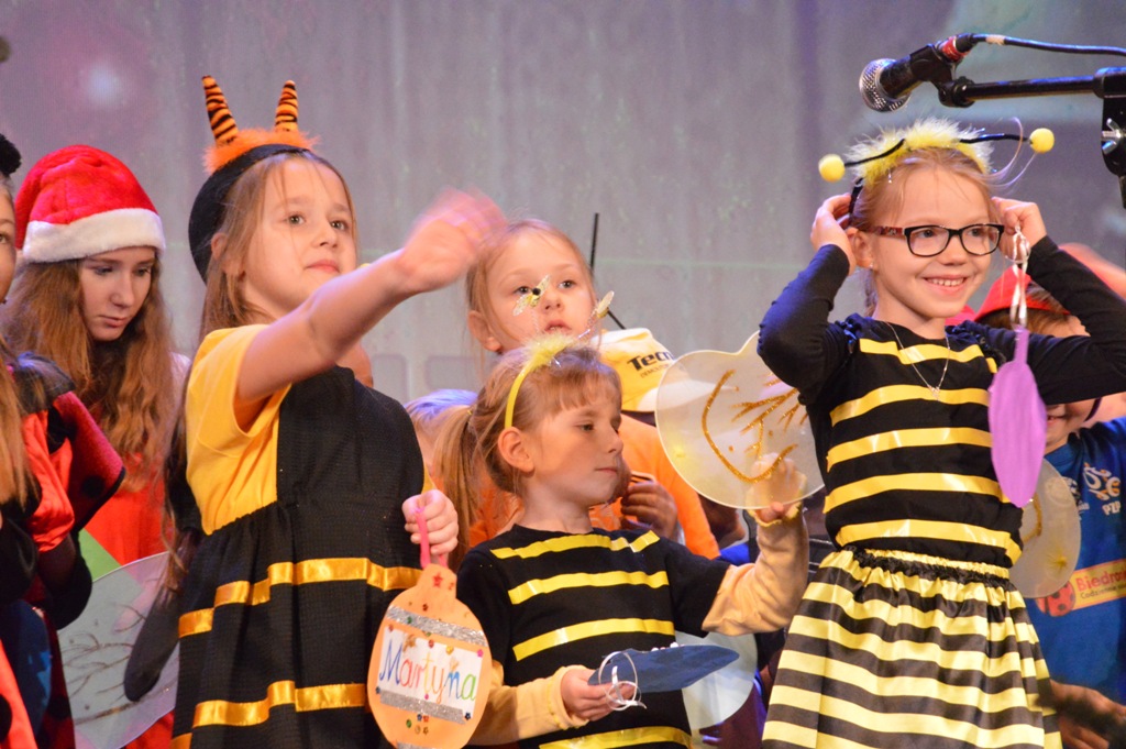 Na scenie wykreowano prawdziwą łąkę, na której pojawiły się biedronki, pszczółki, gąsienice, świetliki i chrząszcze. O grudniowej aurze i zbliżającym się świętym Mikołaju przypominały jedynie choinki i jodłowe gałązki, oraz magiczne dźwięki Jingle Bells płynące ze skrzypiec, którymi Emilka Nalepa z klasy 1a zaczarowała wielobarwną łąkę, dzięki czemu przenieśliśmy się w zimową krainę, czyli Winter Wonderland.