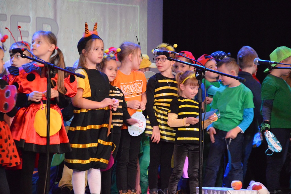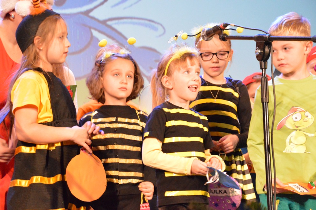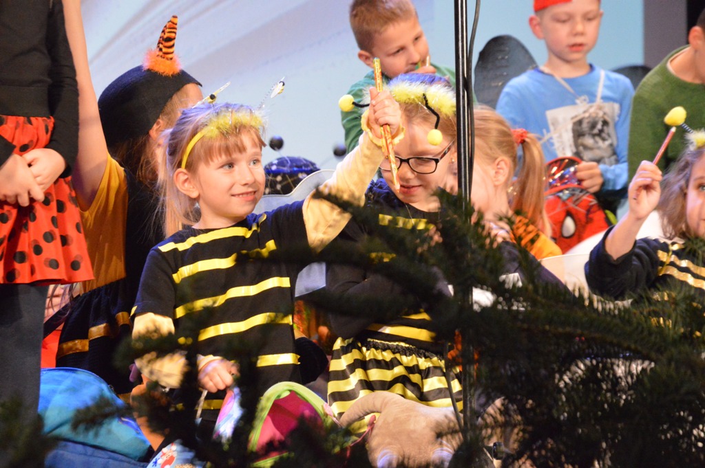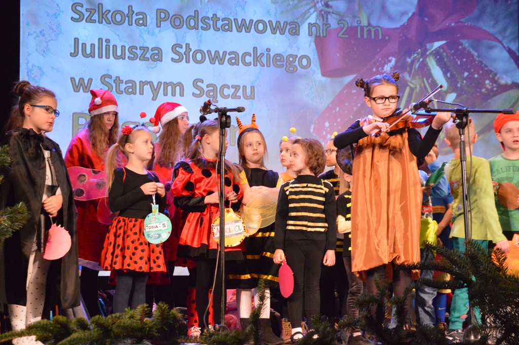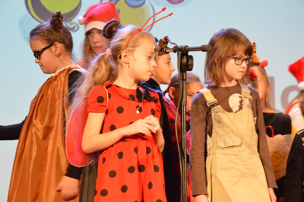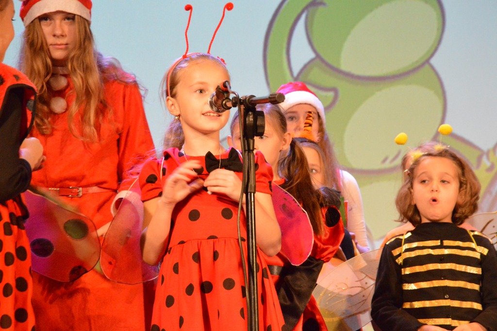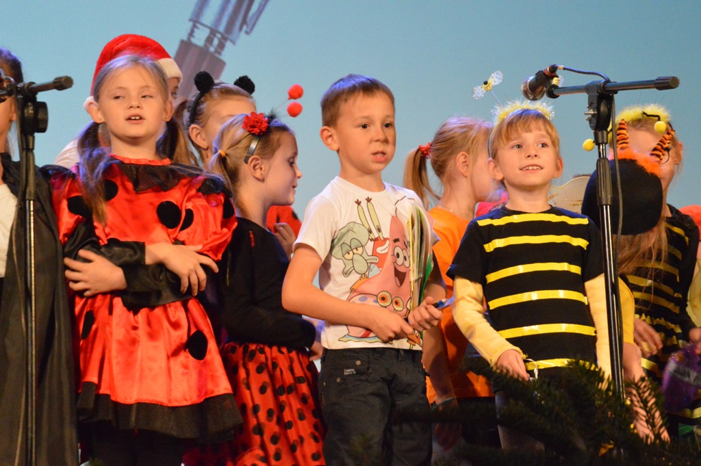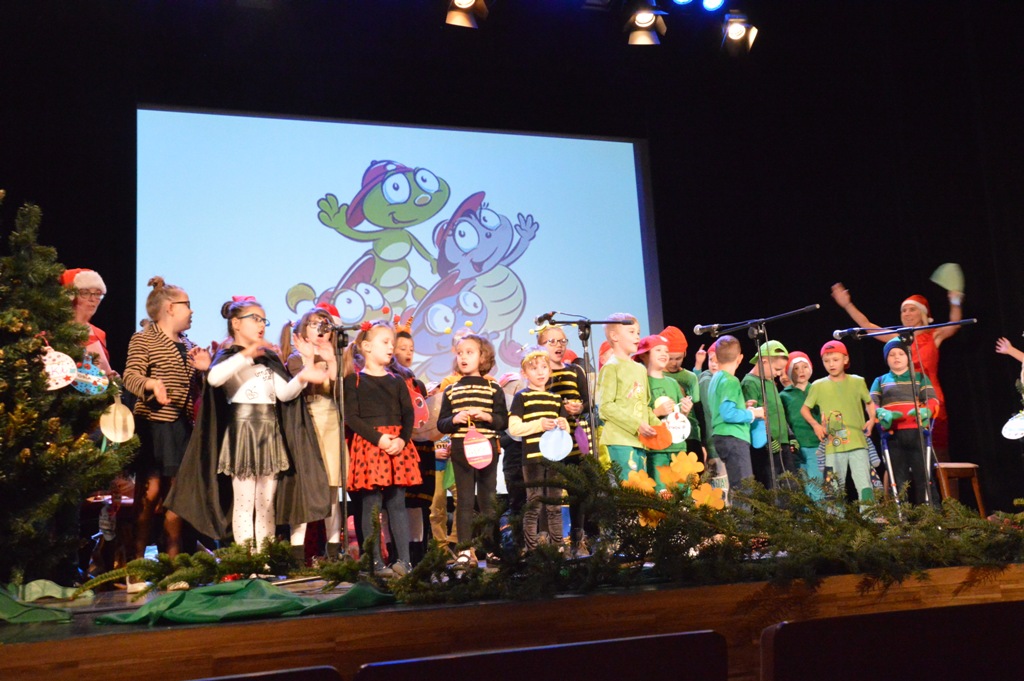 Na scenie wykreowano prawdziwą łąkę, na której pojawiły się biedronki, pszczółki, gąsienice, świetliki i chrząszcze. O grudniowej aurze i zbliżającym się świętym Mikołaju przypominały jedynie choinki i jodłowe gałązki, oraz magiczne dźwięki Jingle Bells płynące ze skrzypiec, którymi Emilka Nalepa z klasy 1a zaczarowała wielobarwną łąkę, dzięki czemu przenieśliśmy się w zimową krainę, czyli Winter Wonderland.