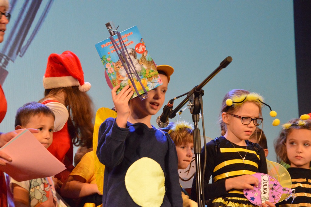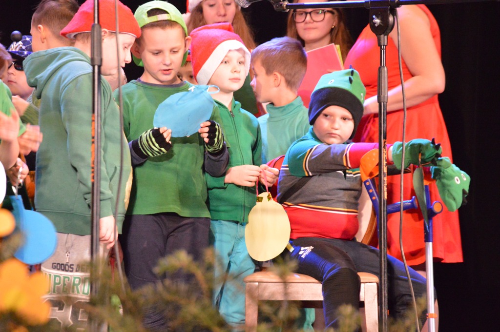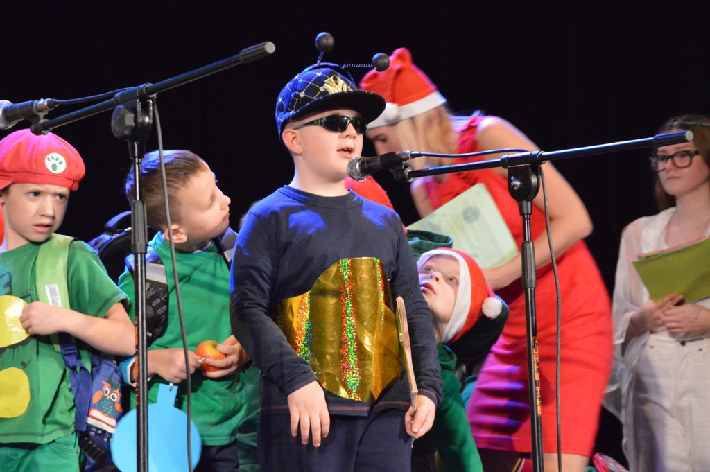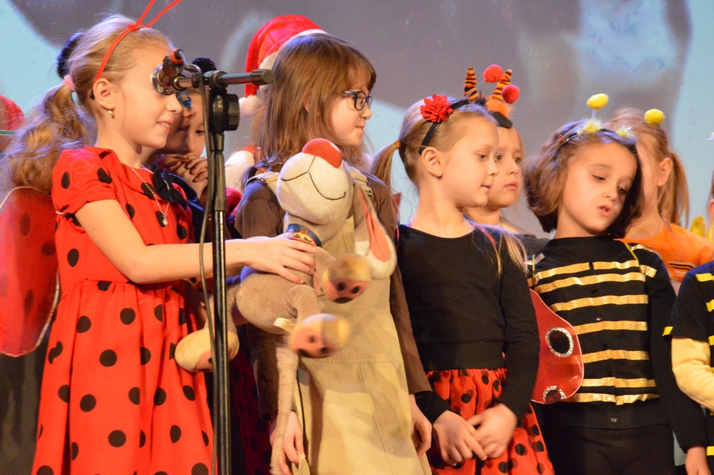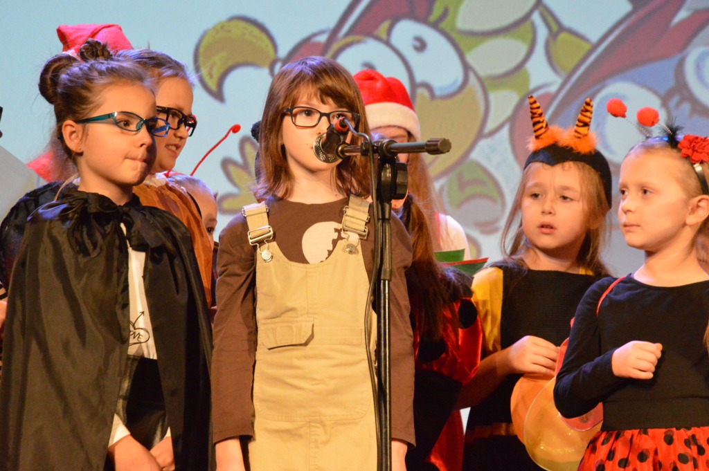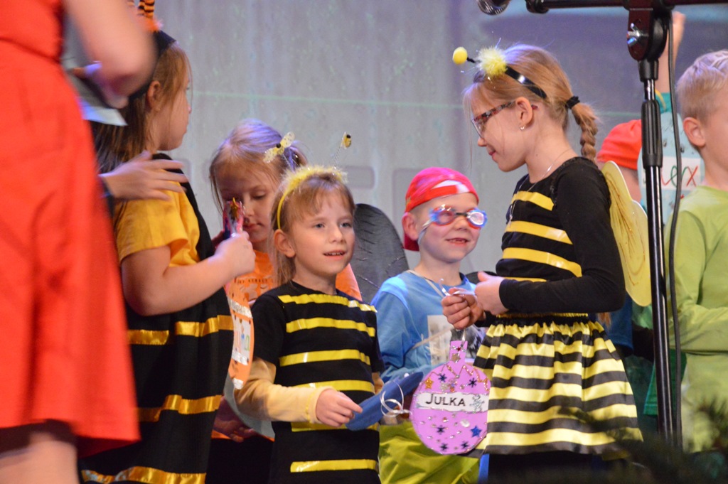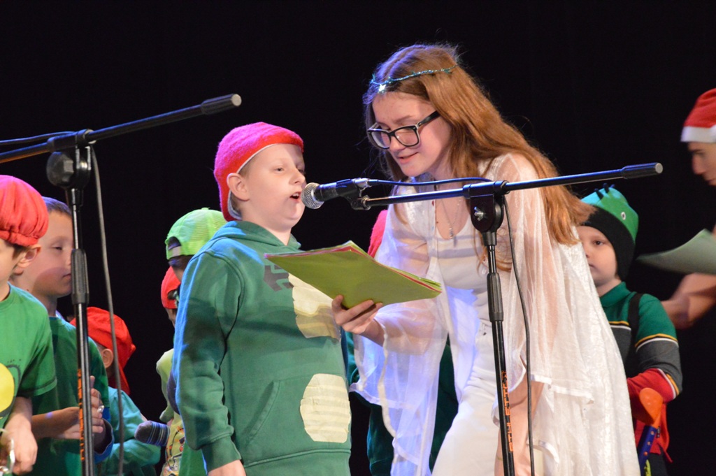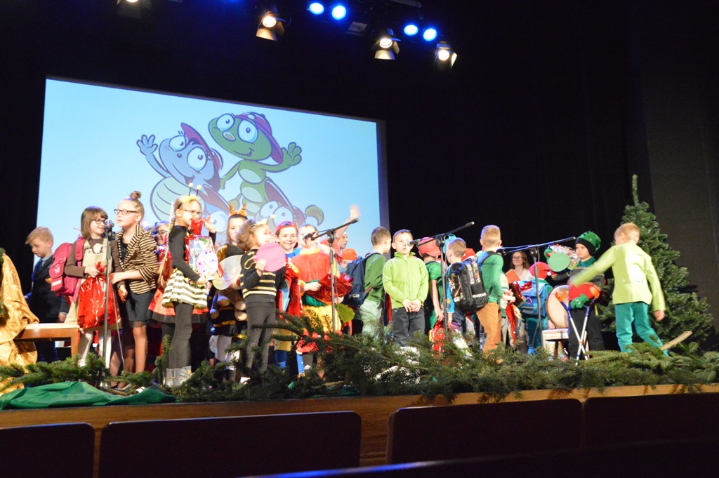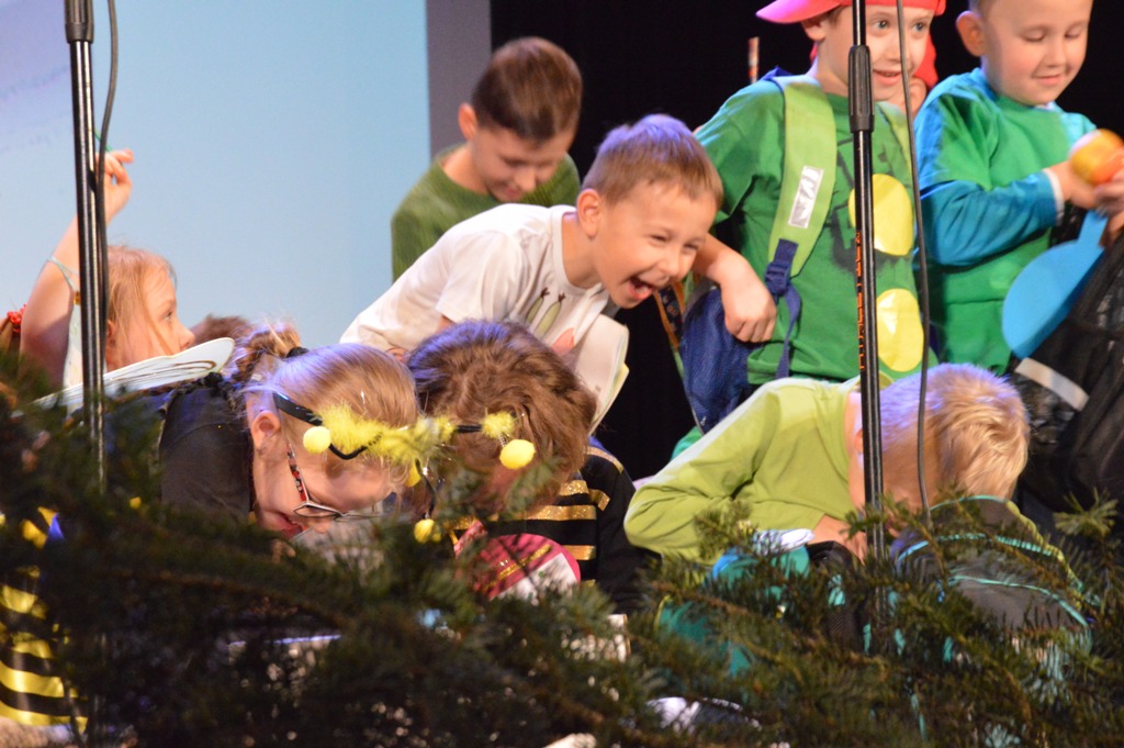 Na scenie wykreowano prawdziwą łąkę, na której pojawiły się biedronki, pszczółki, gąsienice, świetliki i chrząszcze. O grudniowej aurze i zbliżającym się świętym Mikołaju przypominały jedynie choinki i jodłowe gałązki, oraz magiczne dźwięki Jingle Bells płynące ze skrzypiec, którymi Emilka Nalepa z klasy 1a zaczarowała wielobarwną łąkę, dzięki czemu przenieśliśmy się w zimową krainę, czyli Winter Wonderland.