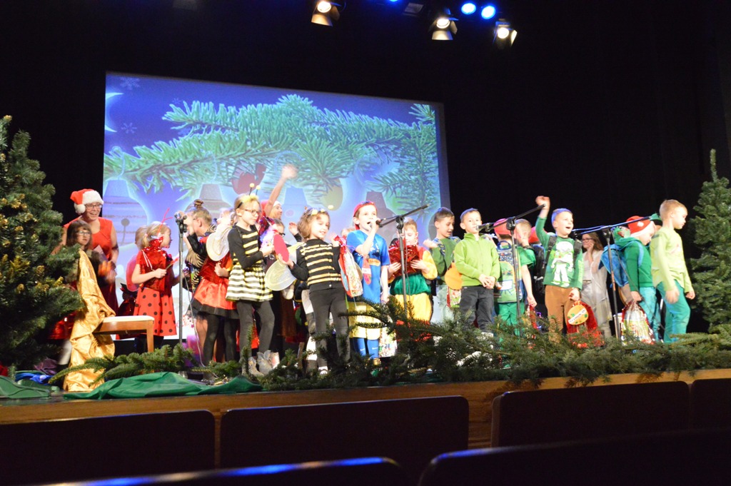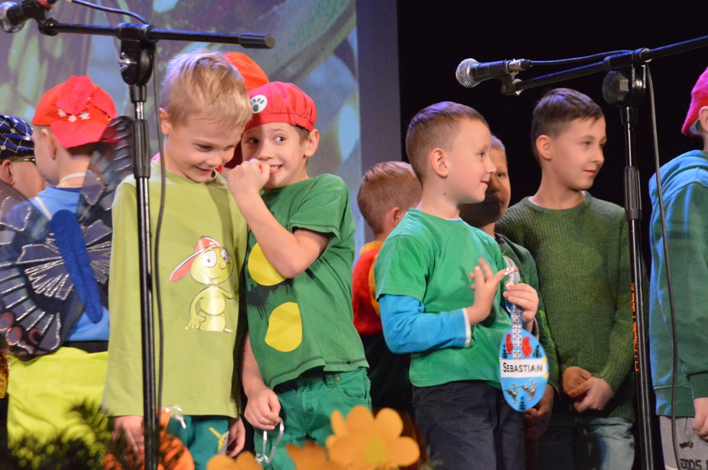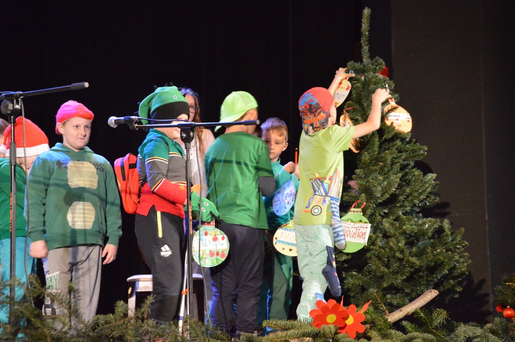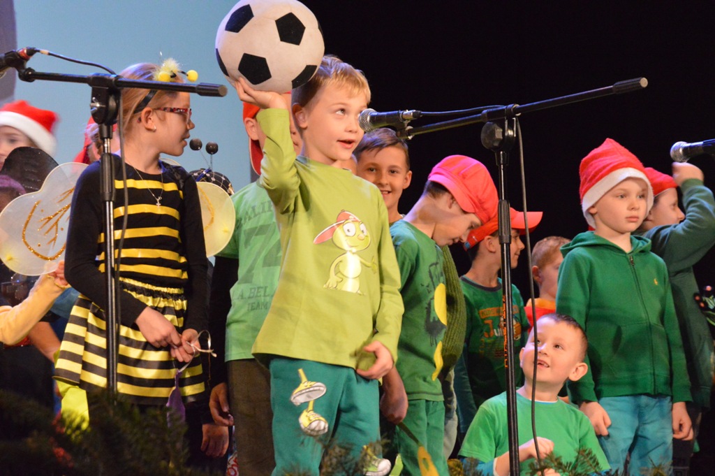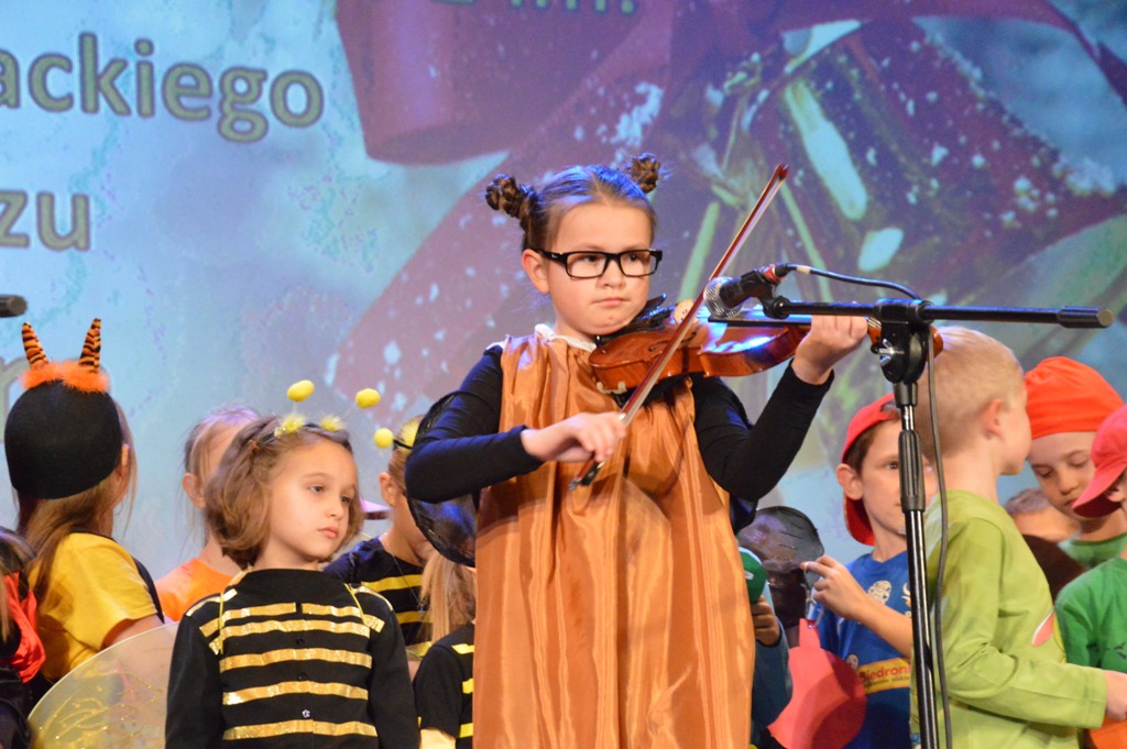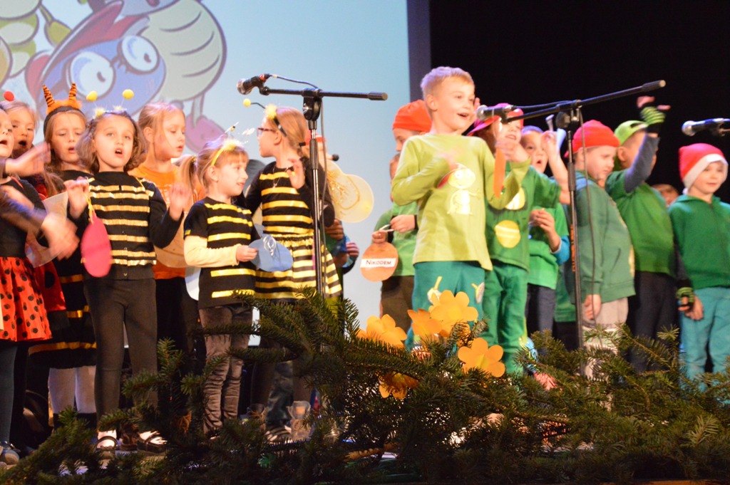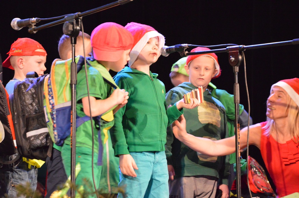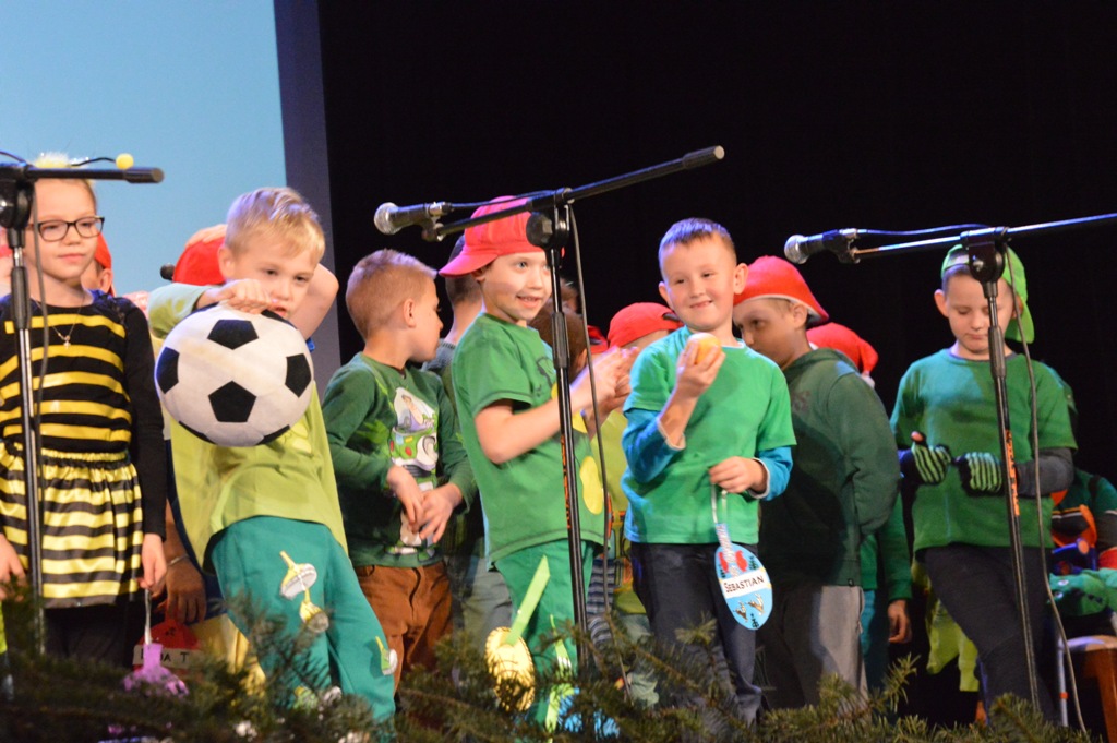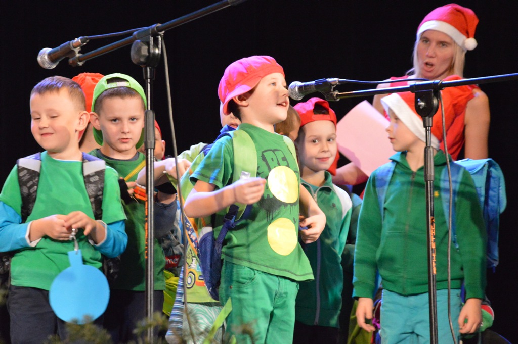 Na scenie wykreowano prawdziwą łąkę, na której pojawiły się biedronki, pszczółki, gąsienice, świetliki i chrząszcze. O grudniowej aurze i zbliżającym się świętym Mikołaju przypominały jedynie choinki i jodłowe gałązki, oraz magiczne dźwięki Jingle Bells płynące ze skrzypiec, którymi Emilka Nalepa z klasy 1a zaczarowała wielobarwną łąkę, dzięki czemu przenieśliśmy się w zimową krainę, czyli Winter Wonderland.
