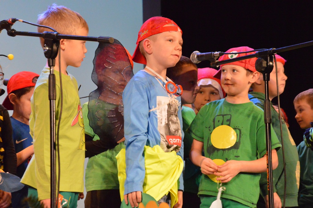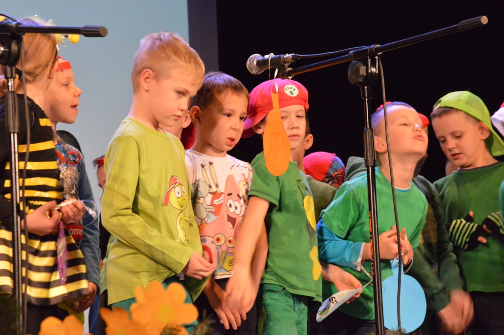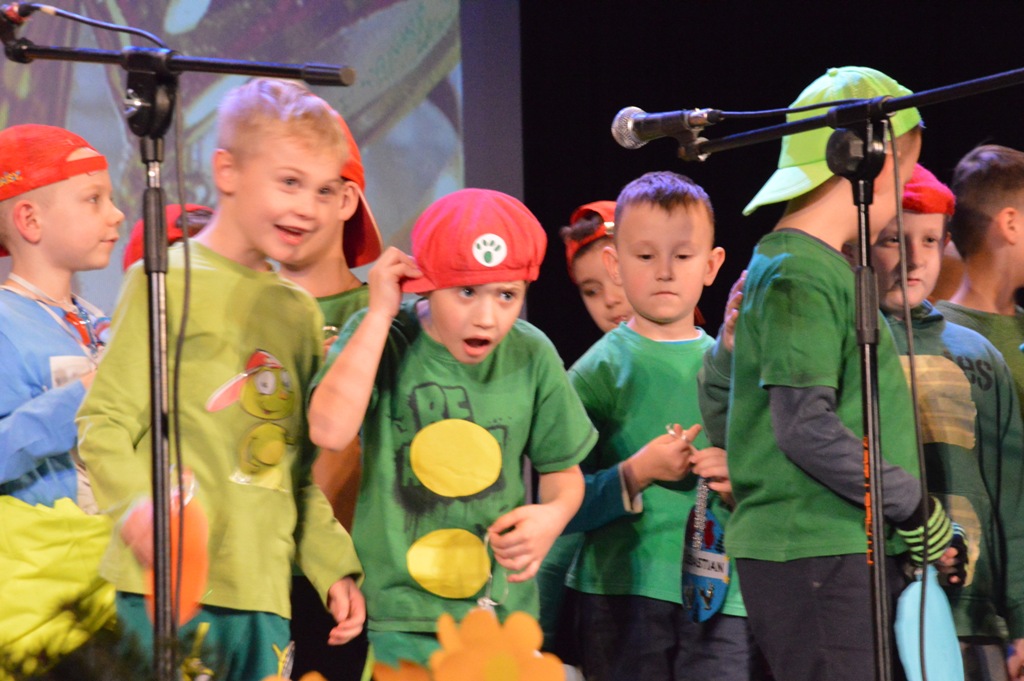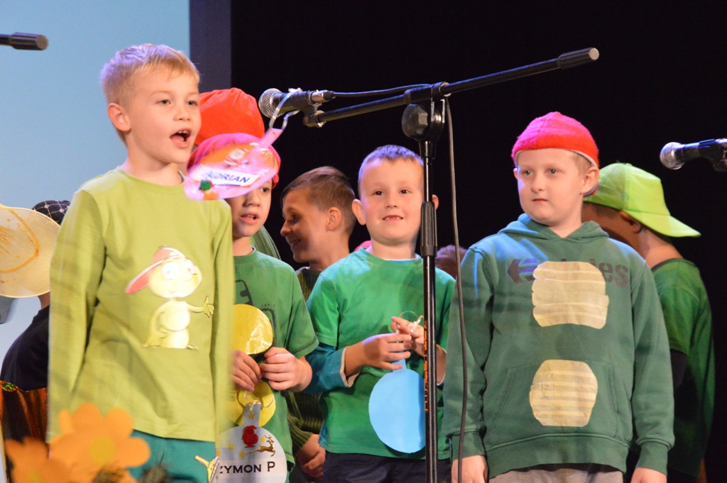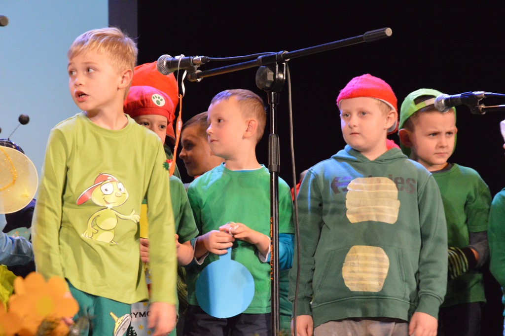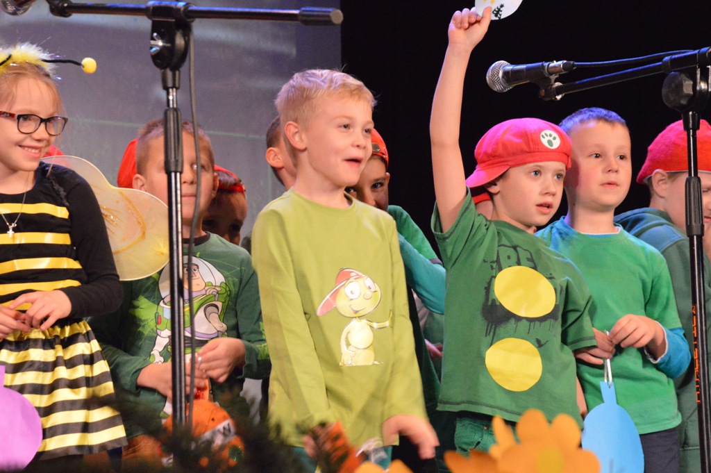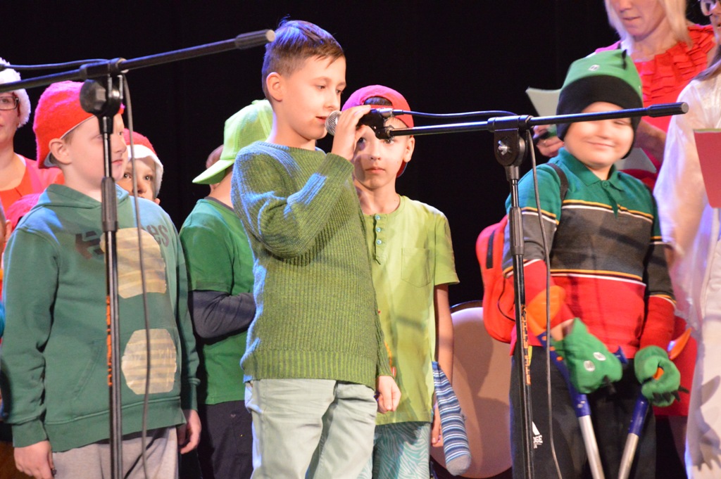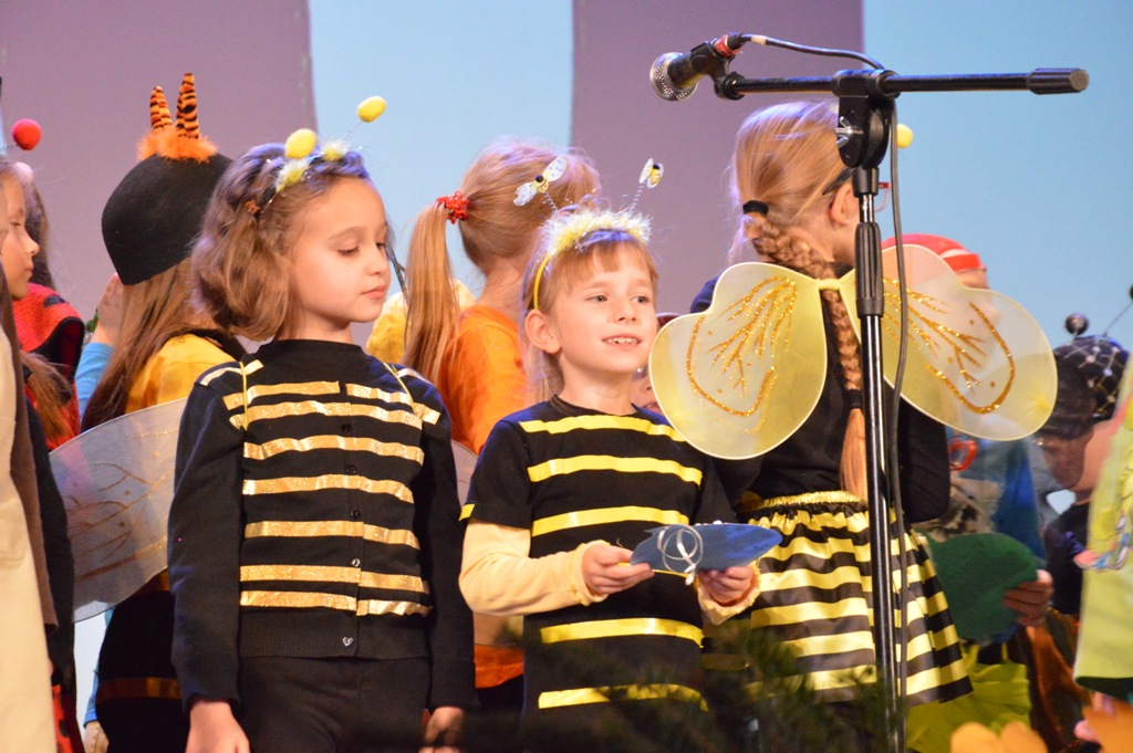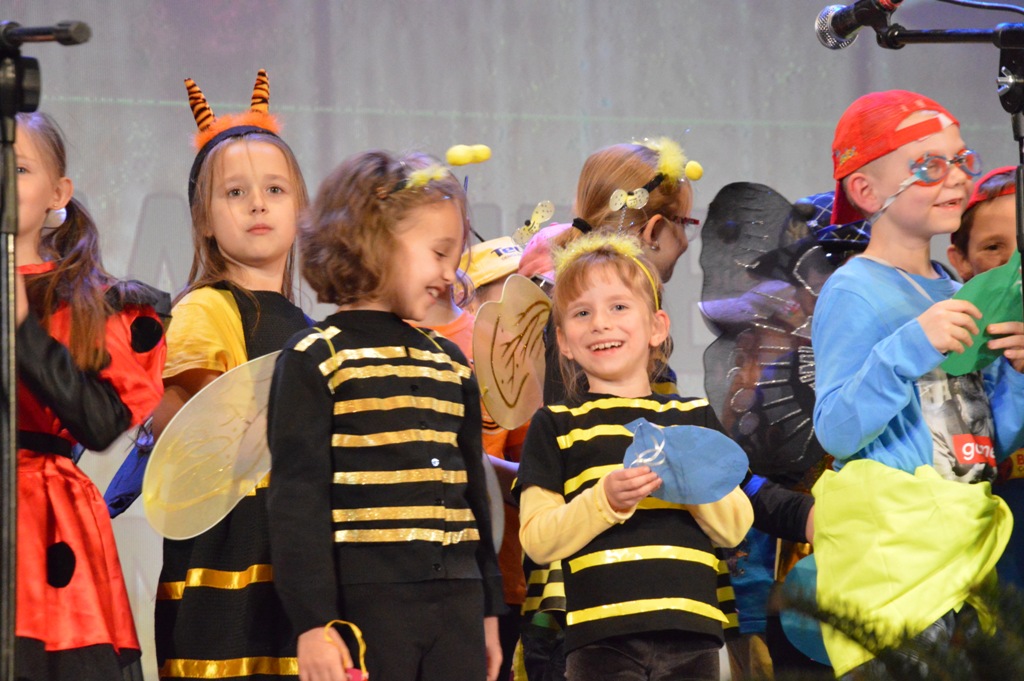 Na scenie wykreowano prawdziwą łąkę, na której pojawiły się biedronki, pszczółki, gąsienice, świetliki i chrząszcze. O grudniowej aurze i zbliżającym się świętym Mikołaju przypominały jedynie choinki i jodłowe gałązki, oraz magiczne dźwięki Jingle Bells płynące ze skrzypiec, którymi Emilka Nalepa z klasy 1a zaczarowała wielobarwną łąkę, dzięki czemu przenieśliśmy się w zimową krainę, czyli Winter Wonderland.
