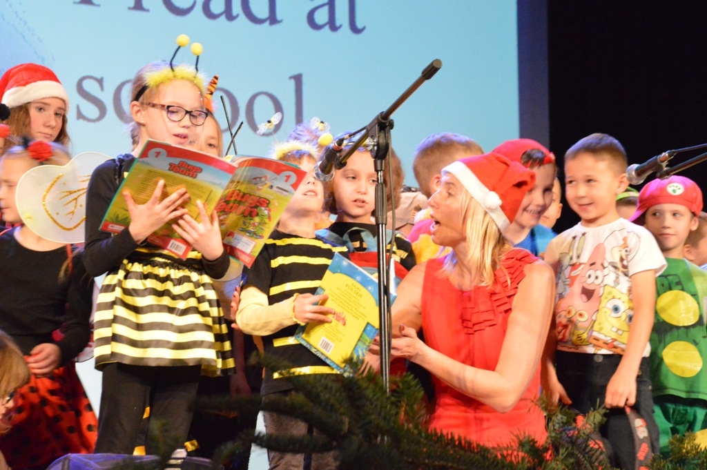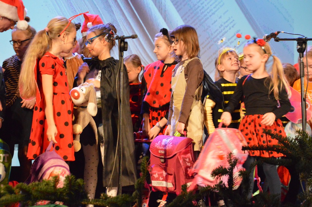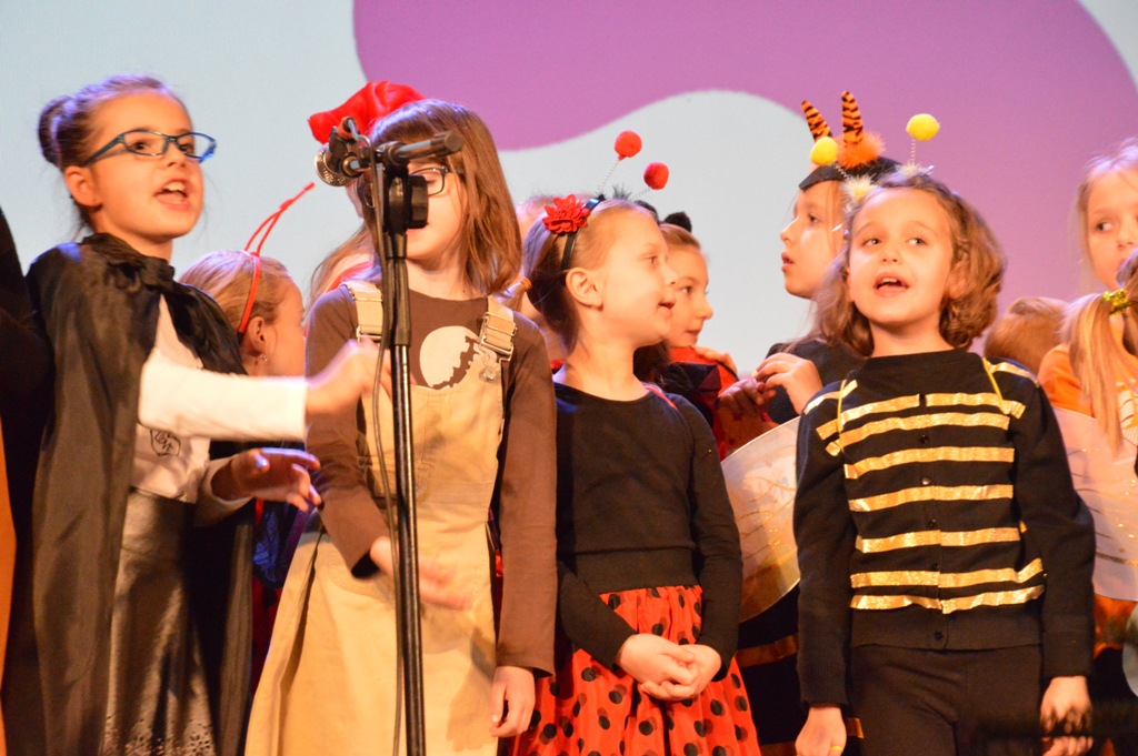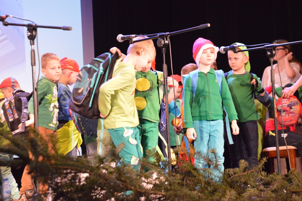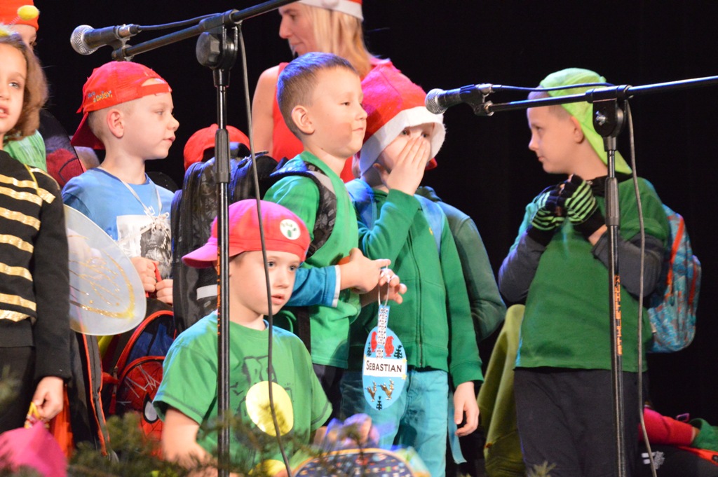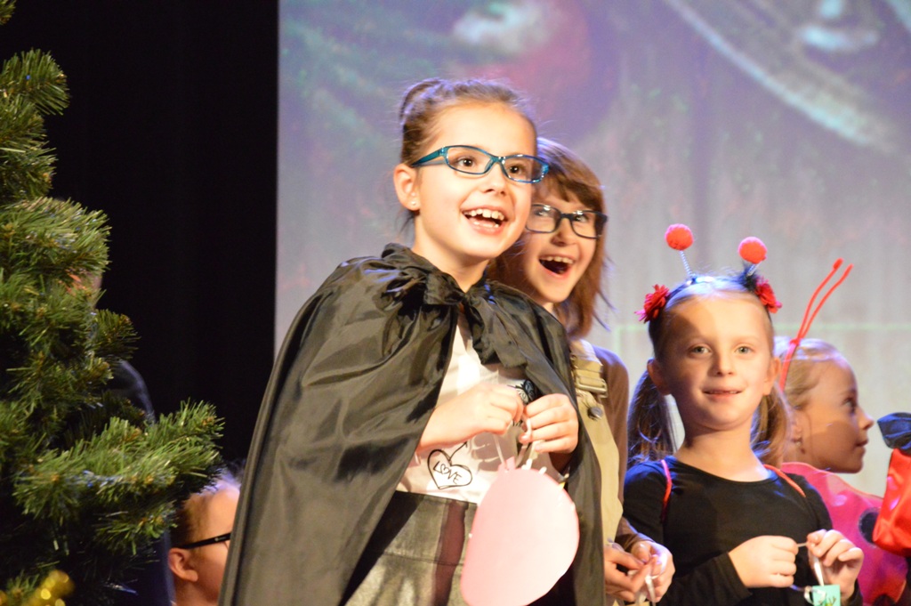 Dzięki zaangażowaniu wszystkich rodziców uczniów klasy 1a i 1b, pierwszoklasiści wyglądali jak prawdziwi bohaterowie z Bugs Team (Drużyny Robaczków), którzy na co dzień towarzyszą im w szkole w nauce języka angielskiego. Niezawodna pomoc rodziców sprawiła, iż każdy z aktorów miał ze sobą plecak szkolny, a w nim nietypowe instrumenty, bo zrobione z przyborów szkolnych. Stanisława Bielak i Bożena Bielak, czyli wychowawczynie klasy 1a i 1b z ogromną życzliwością współpracowały z nauczycielkami języka angielskiego przygotowując wraz z pierwszoklasistami przepiękne bombki z imionami, które nie tylko ozdobiły choinki na scenie, ale także pomogły Mikołajowi, który również mówił po angielsku, poznać wszystkich debiutujących aktorów podczas rozdawania prezentów.