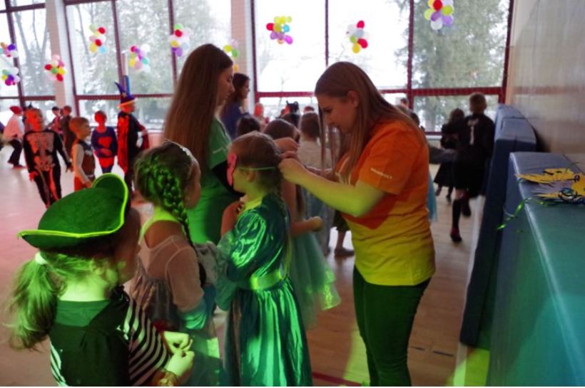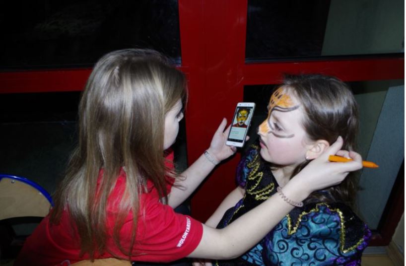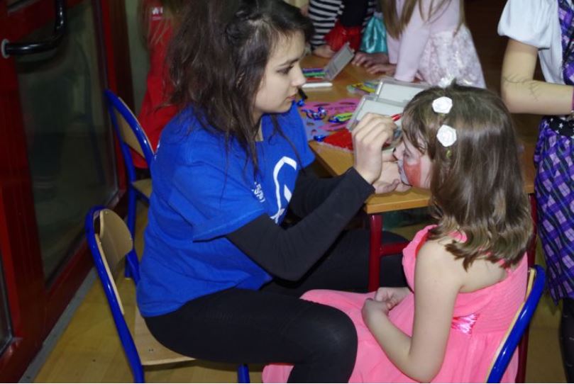 Wolontariuszki: Słowik Dominika, Butas Klaudia, Zasadni Natalia, Jagieła Justyna, Drożdz Kinga, Kumorek Adrianna, Bocheńska Julia, Tokarczyk Dominika, Słowik Katarzyna, Kożuch Alicja i Pyrdoł Aleksandra –przygotowały maski karnawałowe dla dzieci, malowały twarze oraz wspólnie z nimi tańczyły. Zabawa była naprawdę wyśmienita. Na zakończenie każdy mały uczestnik zabawy otrzymał balon. Bardzo dziękujemy wolontariuszkom za czas i zaangażowanie.