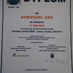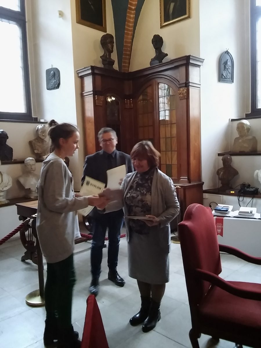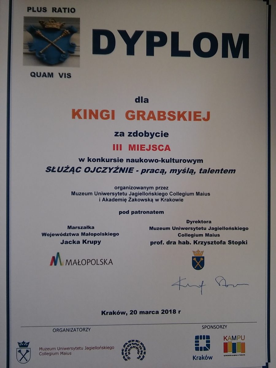 Zwycięzcami pilotażowgo konkursu zorganizowanego dla uczestników projektu „Przygoda z nauką w murach UJ” zostali: Michał Brzeziński uhonorowany I miejscem, Agnieszka Żak nagrodzona II miejscem, Kinga Grabska wyróżniona III miejscem. Decyzją jury konkursu wyróżnienie I stopnia przyznano: Beniaminowi Buchmanowi, Norbertowi Olszowskiemu, Poli Pietrzak i Jakubowi Treitowi. Wyróżnienie II stopnia odebrali: Katarzyna Łubik, Aleksandra Sztafa, Martyna Wnęk, Wojciech Kurzeja oraz Bartosz Zaremba. Nagrody i dyplomy ambitnym „studentom” wręczyły: Pani mgr Wioletta Kolbusz Lasa reprezentująca Collegium Maius UJ oraz przedstawicielka Akademii Żakowskiej, prezes STOWARZYSZENIA SZERSZE HORYZONTY Pani mgr Aleksandra Rzońca.