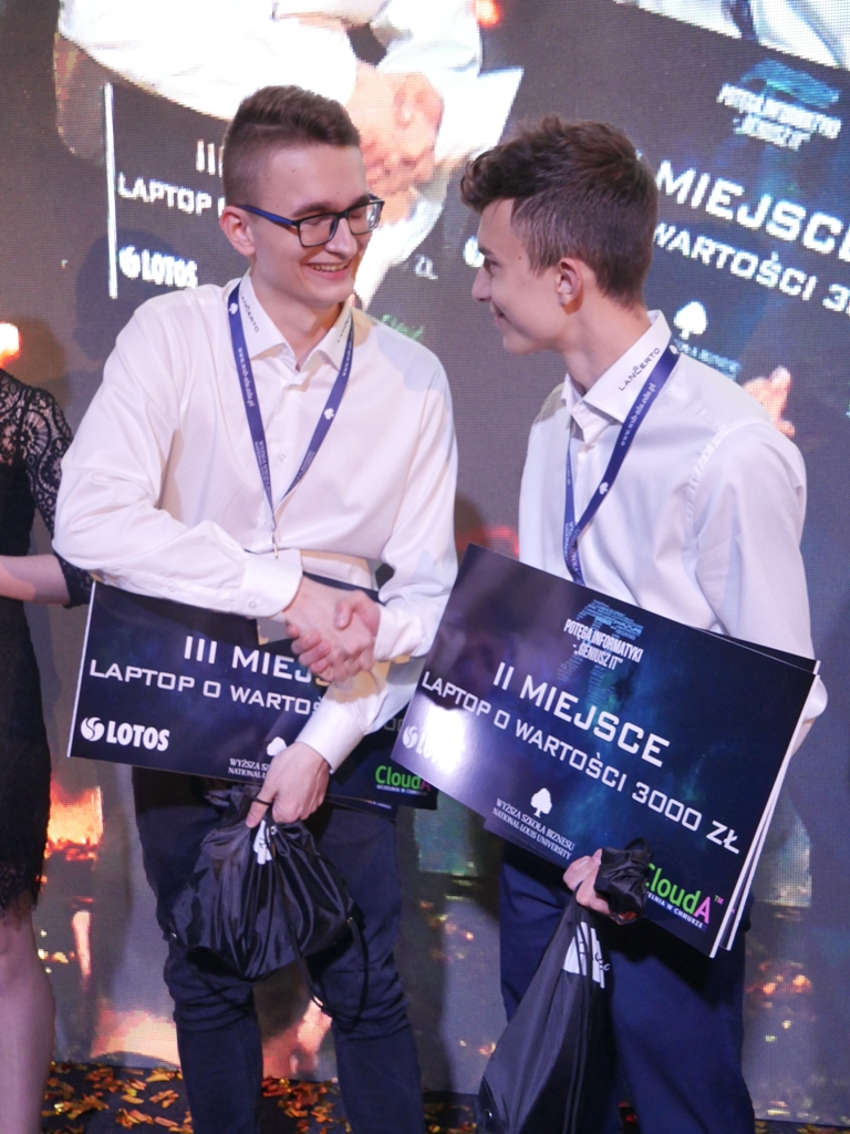 Zdobywcy drugiego i trzeciego miejsca, Dawid Matras z Limanowej oraz Iwo Plaza z Knurowa, otrzymali laptopy o wartości 3 000 zł każdy oraz vouchery na studia w WSB-NLU.
