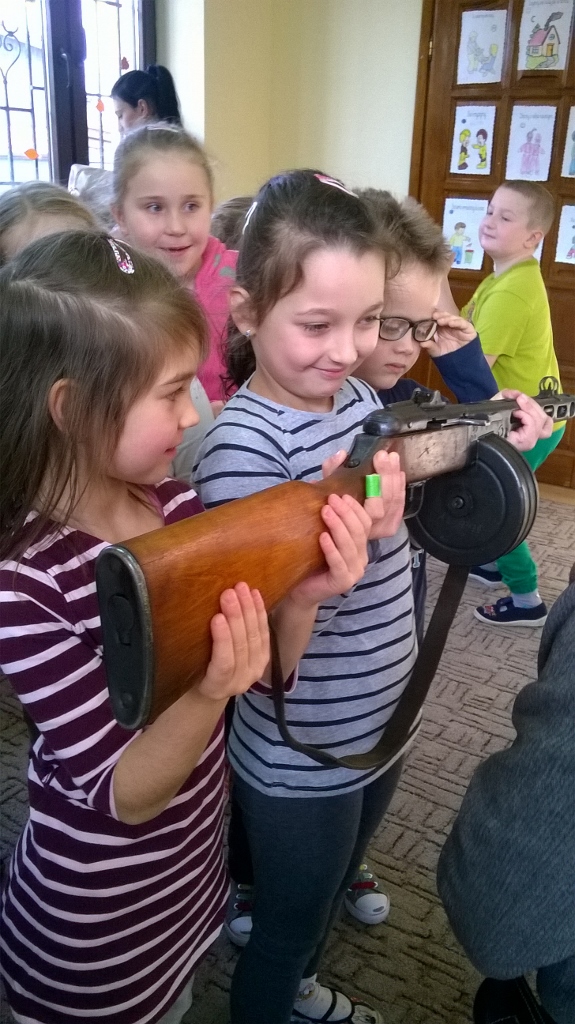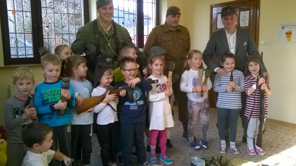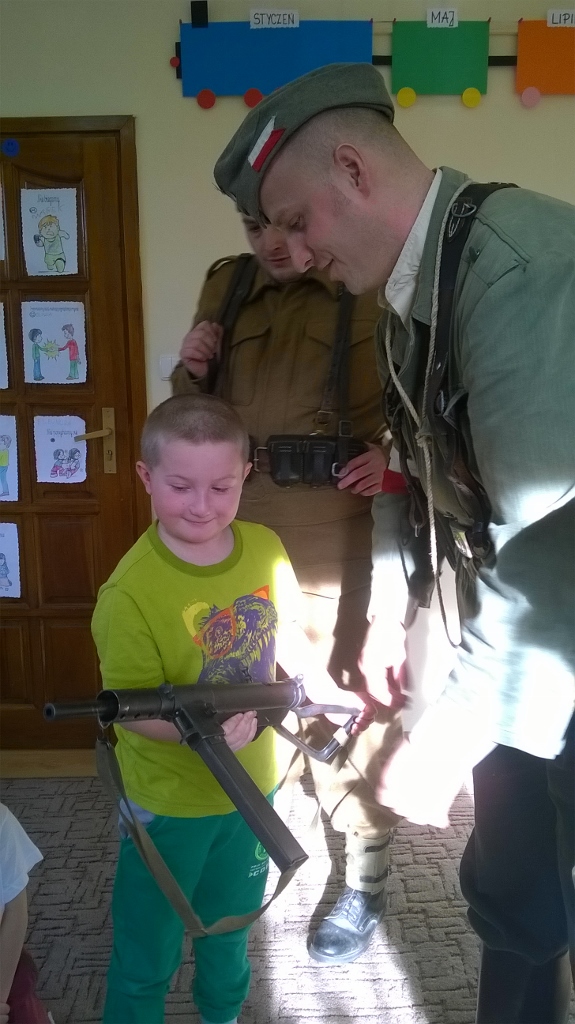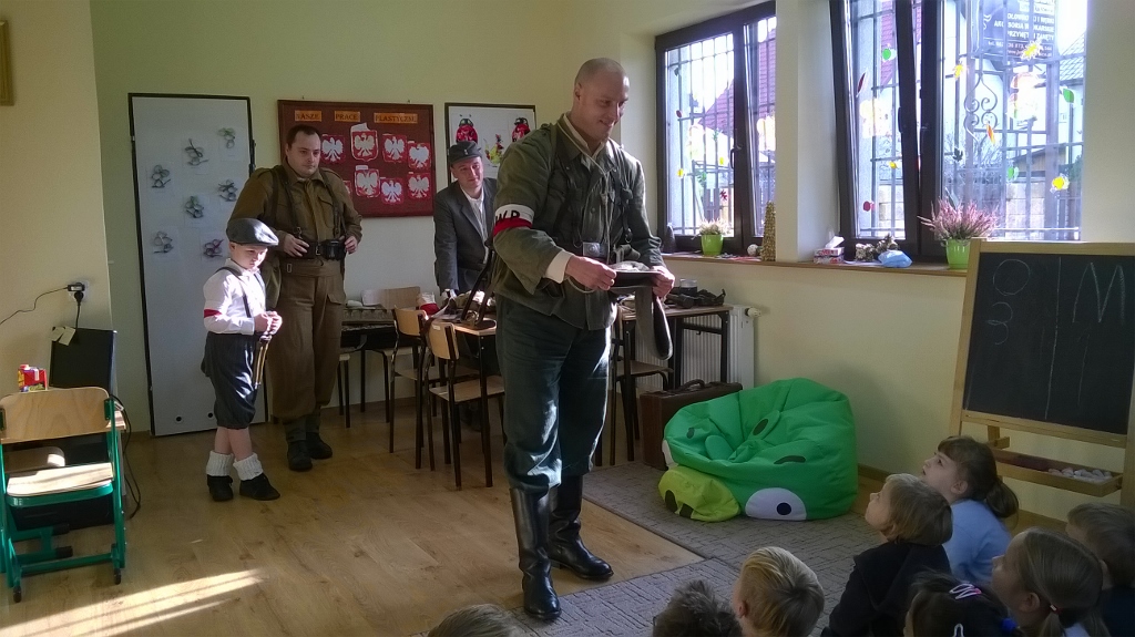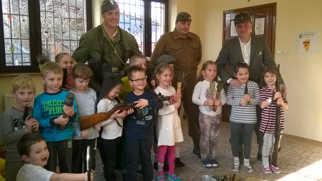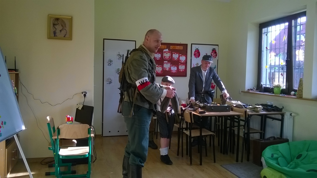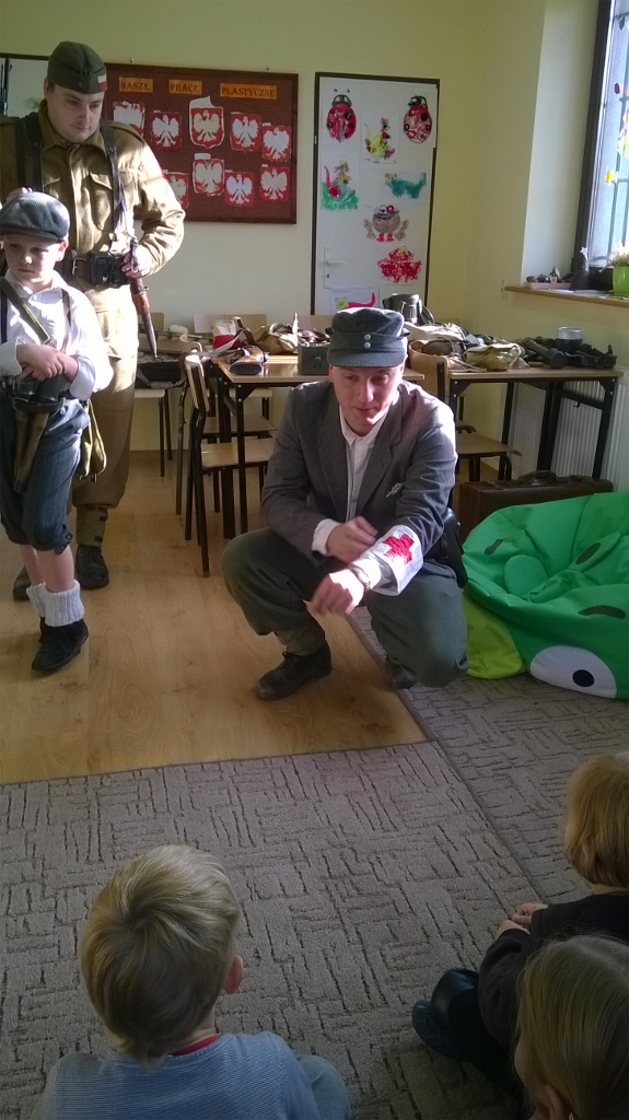 Panowie: Lucjan Kantor – pseudonim „Kadet, Sławomir Szubryt „Owoc” , Krzysztof Szubryt „Niedźwiedź” i 8-letni Kubuś Szubryt z pasją opowiadali dzieciom dzieje naszych dziadków i pradziadków. Zaproszeni przez wychowawczynię goście przedstawili podstawowe umundurowanie i wyposażenie żołnierza z okresu II wojny światowej. Pierwszoklasiści mieli okazję zapoznać się z bronią palną (MAUSER, STEN, MK2, PPSH41, LUGER, WALTHER, P38), bronią białą, bagnetami oraz różnego typu granatami.