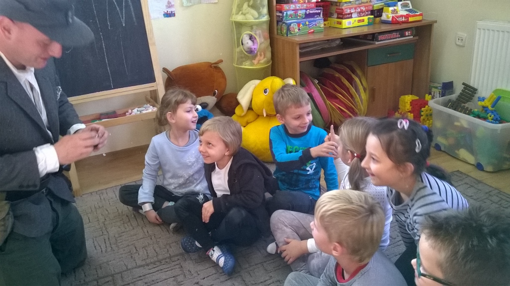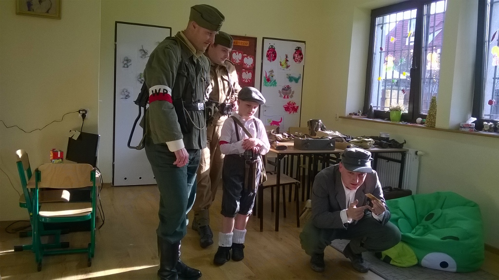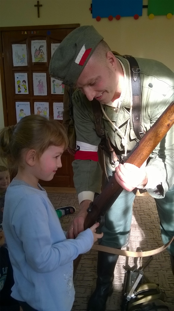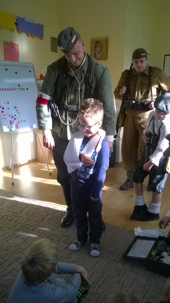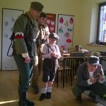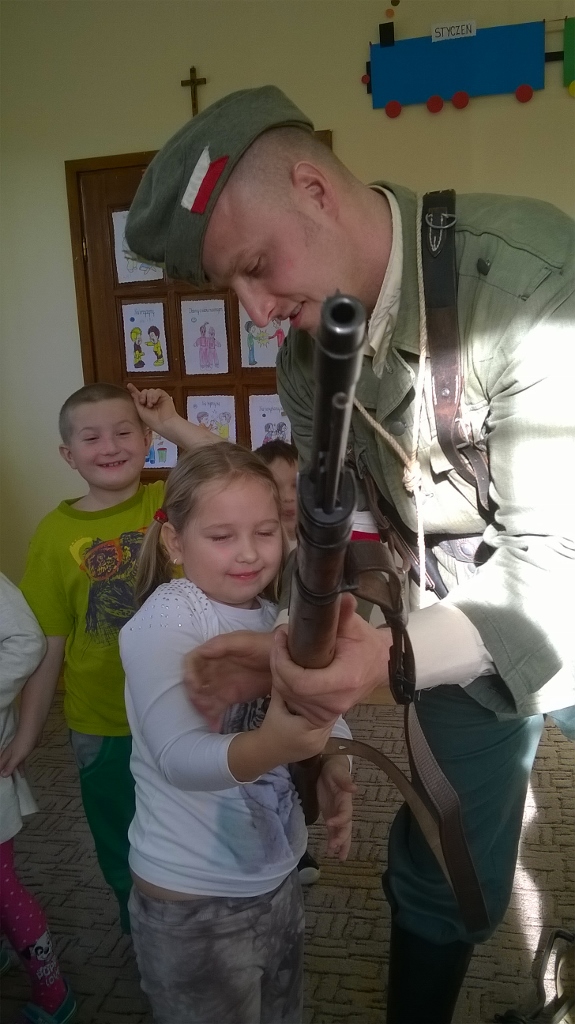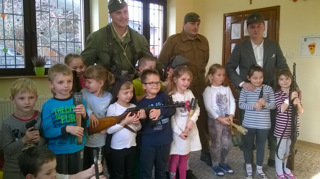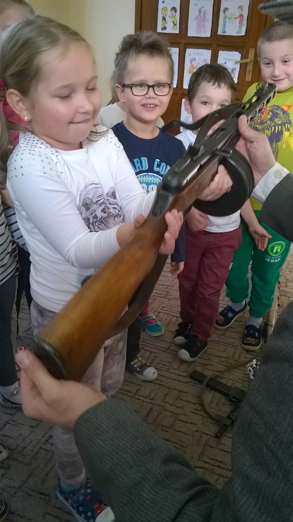 Panowie: Lucjan Kantor – pseudonim „Kadet, Sławomir Szubryt „Owoc” , Krzysztof Szubryt „Niedźwiedź” i 8-letni Kubuś Szubryt z pasją opowiadali dzieciom dzieje naszych dziadków i pradziadków. Zaproszeni przez wychowawczynię goście przedstawili podstawowe umundurowanie i wyposażenie żołnierza z okresu II wojny światowej. Pierwszoklasiści mieli okazję zapoznać się z bronią palną (MAUSER, STEN, MK2, PPSH41, LUGER, WALTHER, P38), bronią białą, bagnetami oraz różnego typu granatami.