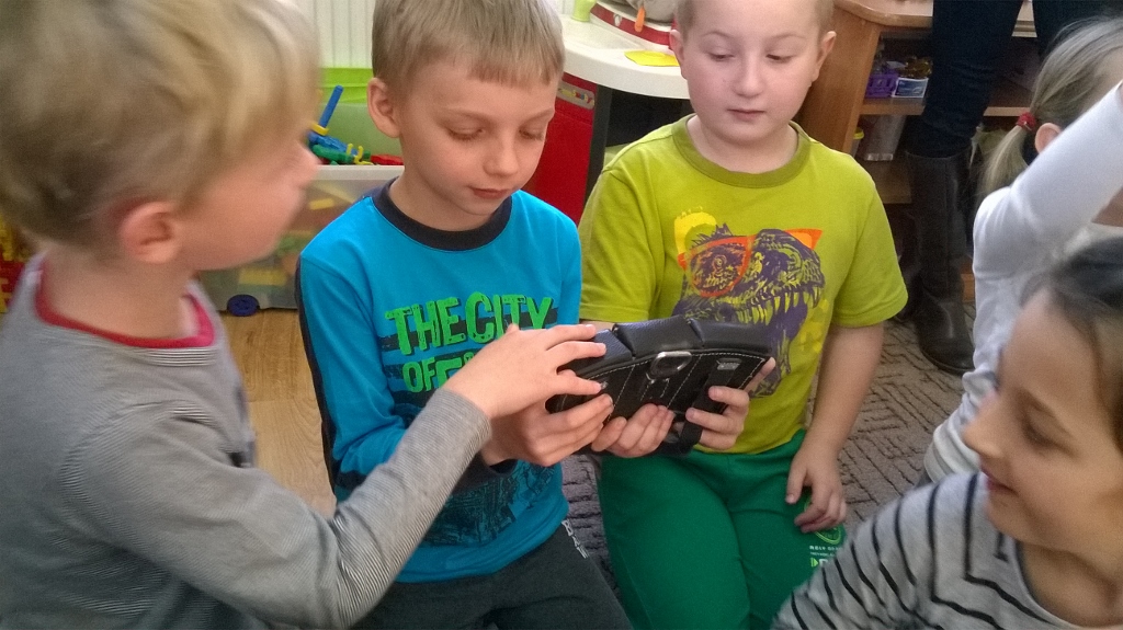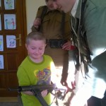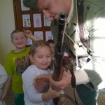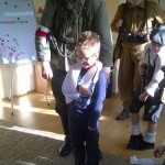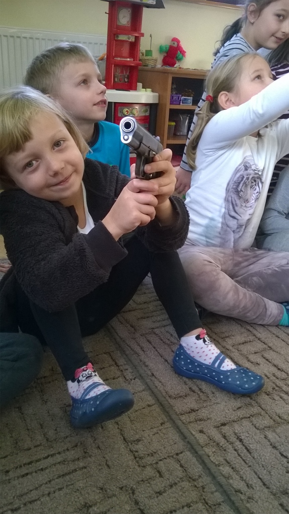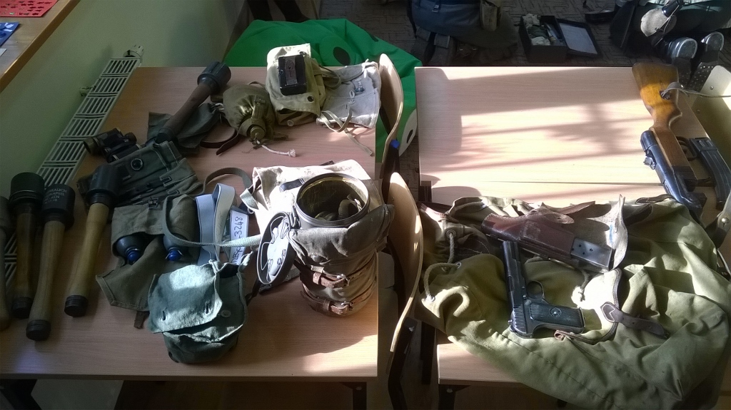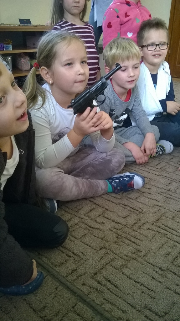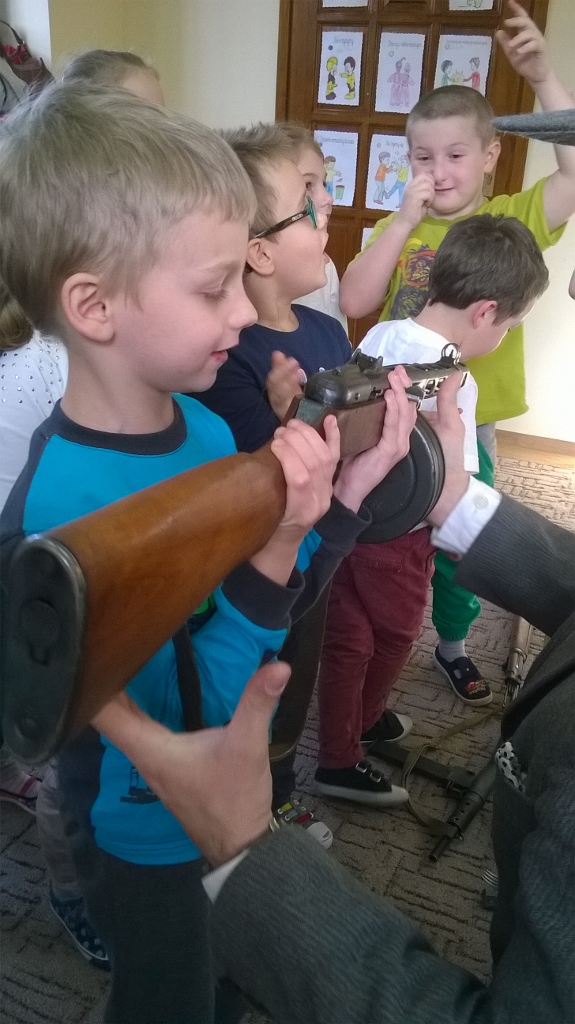 Uczniowie osobiście sprawdzali sposób obsługi i noszenia broni oraz jej wagę. Pan Sławomir Szubryt opowiedział dzieciom skąd żołnierze w czasach wojny pozyskiwali broń i w jaki sposób ją kolonizowali. Zwrócił uwagę na fakt, iż większość posiadanej broni i mundurów pochodziła z łupów, następnie zacierano ślady pochodzenia, a z puszek po jedzeniu wycinano orła polskiego i mocowano go na czapkach i mundurach. Pan Lucjan Kantor z ogromną dokładnością przedstawił dzieciom wyposażenie apteczki wojskowej (uczniowie mieli okazję zapoznać się ze sposobem odkażania ran, robienia opatrunków itp.) oraz zapoznał ich z podstawowymi przyborami higienicznymi.