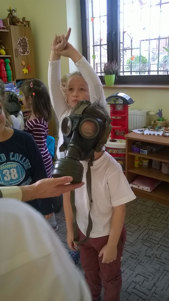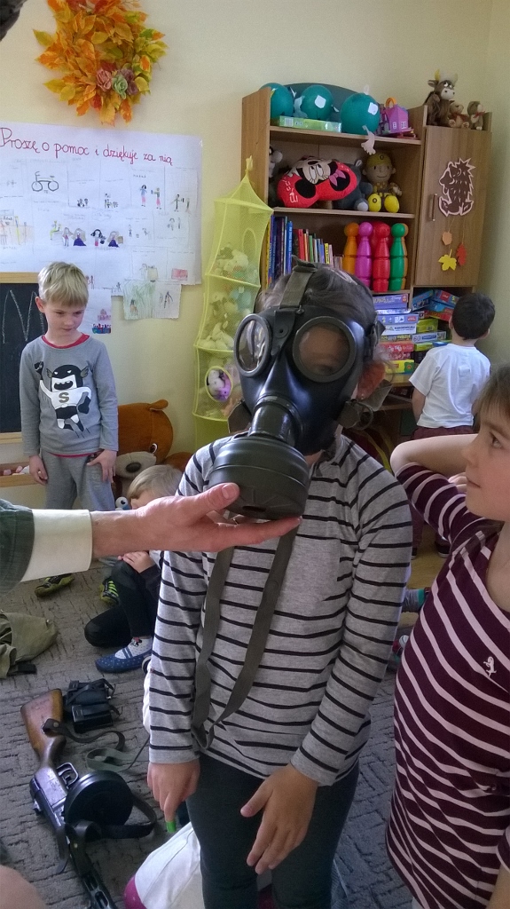 Pan Krzysztof Szubryt szczegółowo opisał mundur oraz każdą kieszeń, którą żołnierz doskonale potrafił wykorzystać. Pierwszoklasiści przymierzali również wojskowe okulary przeciwsłoneczne i maski gazowe. Uczniowie z zafascynowaniem słuchali opowieści o życiu polskich żołnierzy i partyzantów, sposobach przechowywania i spożywania posiłków oraz spędzania „wolnego” czasu. Wszystkie akcesoria, które dzieci zobaczyły podczas lekcji, były oryginalne i pochodziły z okresu II wojny światowej.