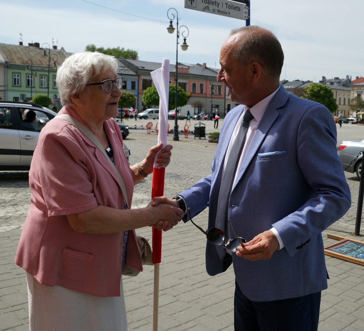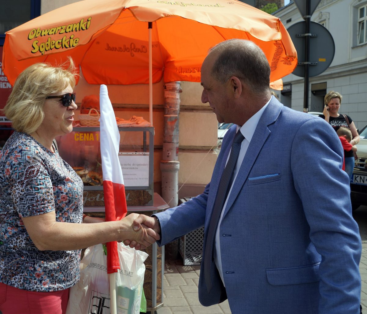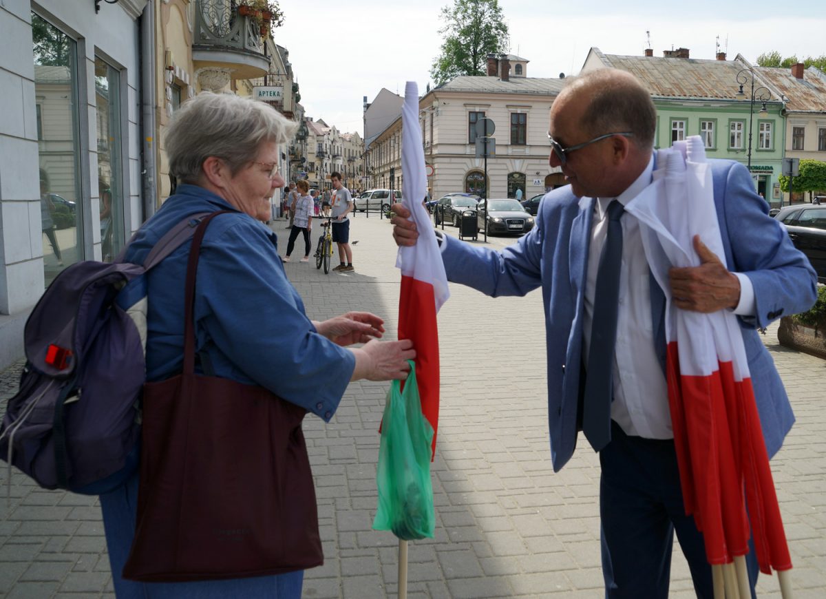 400 biało-czerwonych flag rozdał na nowosądeckim rynku wojewoda małopolski Piotr Ćwik. W akcję włączył się starosta nowosądecki Marek Pławiak.