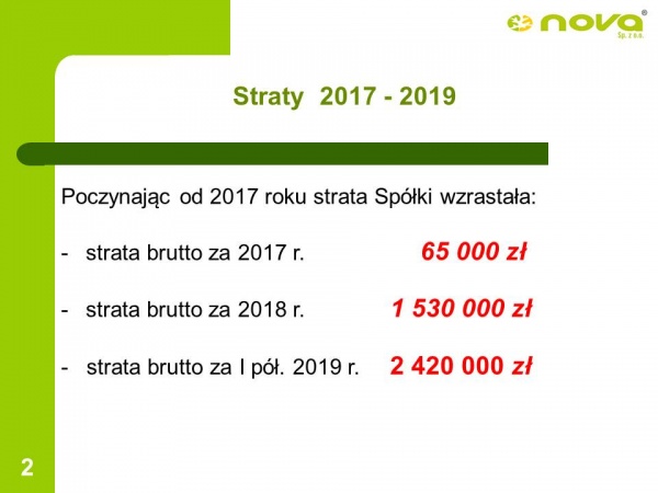 – Poczynając od 2017 roku strata Spółki wzrastała – mówił wiceprezes Dawid Bednarski. – Strata brutto za 2017 rok wyniosła 65 000 złotych, za 2018 rok było to już 1 530 000 złotych, a za pierwszą połowę 2019 roku 2 420 000 złotych.