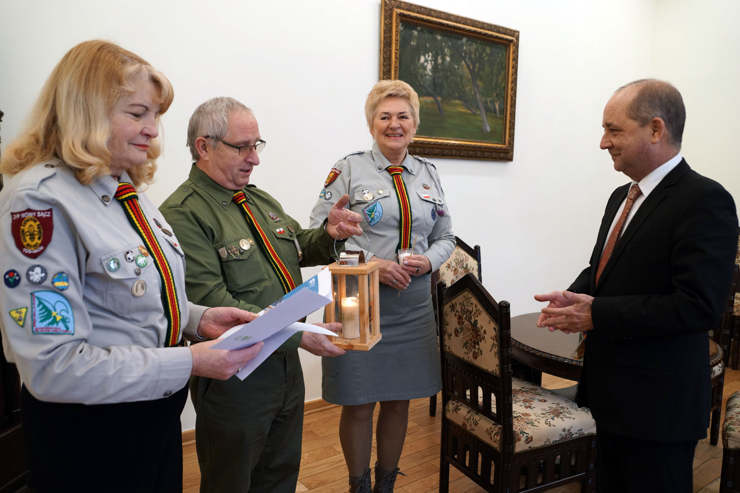Przedstawiciele Hufca ZHP w Nowym Sączu wręczyli staroście nowosądeckiemu Markowi Pławiakowi Betlejemskie Światło Pokoju.
