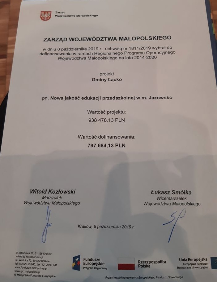 Dokument ten gwarantuje przyznanie Gminie Łącko środków w wysokości niemalże 800 tys. zł – przy całkowitej wartości zadania bliskiej 940 tys. zł. – na utworzenie przedszkola w Jazowsku wraz z poszerzeniem oferty przedszkolnej i adaptacją pomieszczeń na ten cel.