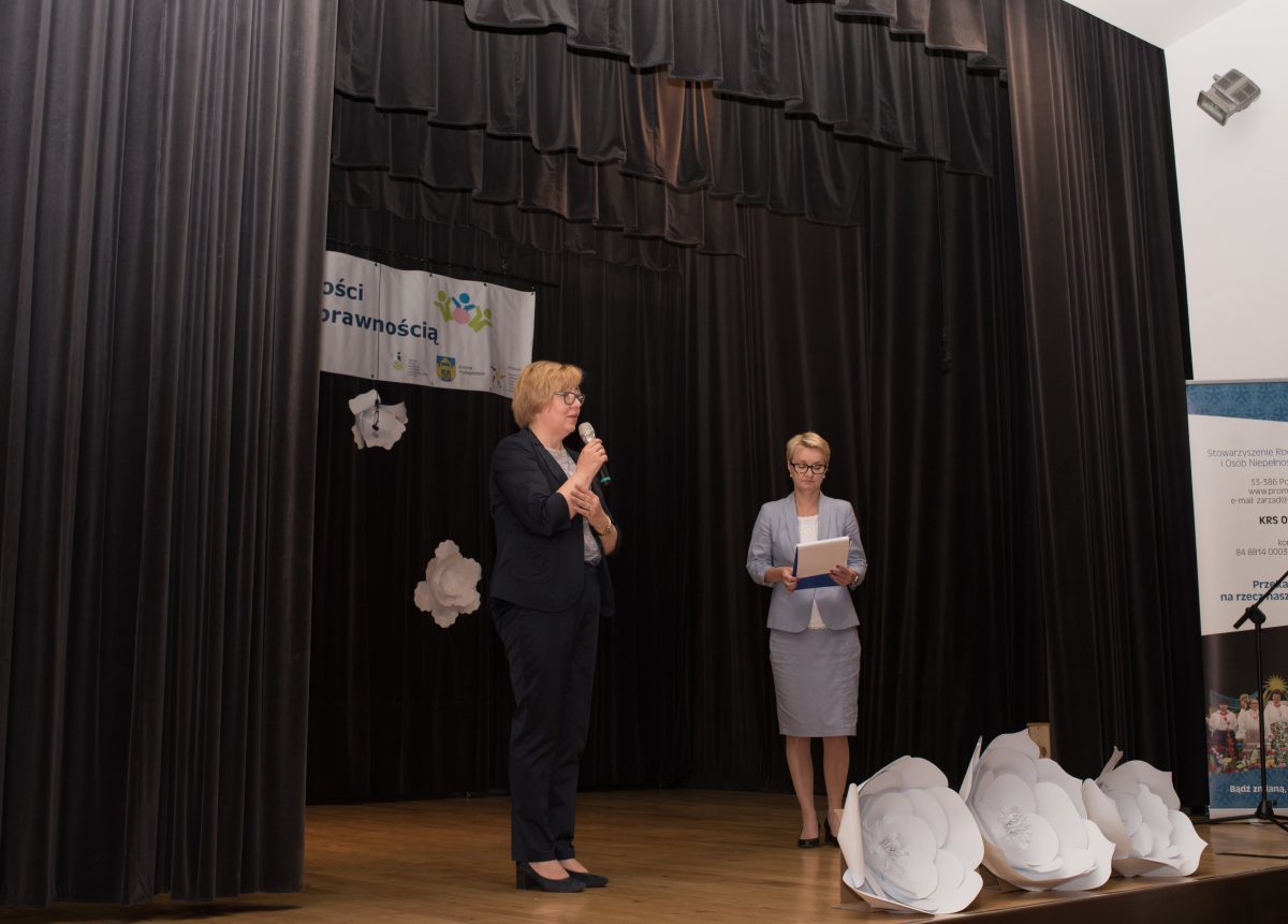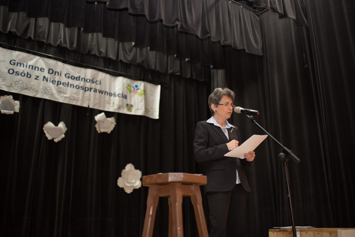 Drugą część „Dni Godności…” zainaugurował chór „Wiolino” pod dyrekcją Pani Małgorzaty Liber wzruszającą piosenką „Bóg się mamo nie pomylił” autorstwa Tomasza. Kierownik Warsztatu Terapii Zajęciowej w Gostwicy – Urszula Potoniec – Mędoń powitała wszystkich zebranych – podopiecznych Stowarzyszenia „Promyk”, ich rodziców i opiekunów, przedstawicieli Starostwa Powiatowego i PCPR w Nowym Sączu, dyrektorów szkół podstawowych z gminy Podegrodzie – i poprosiła o rozpoczęcie wydarzenia panią wójt Małgorzatę Gromalę. Pani Wójt powitała wszystkich i podziękowała za realizację wydarzeń tego typu w gminie. Jako kolejna zabrała głos pani Marta Mordarska – dyrektor Małopolskiego Oddziału PFRON, podziękowała organizatorom za współpracę i zaprosiła na Dni Godności organizowane w najbliższym czasie w Starym Sączu.