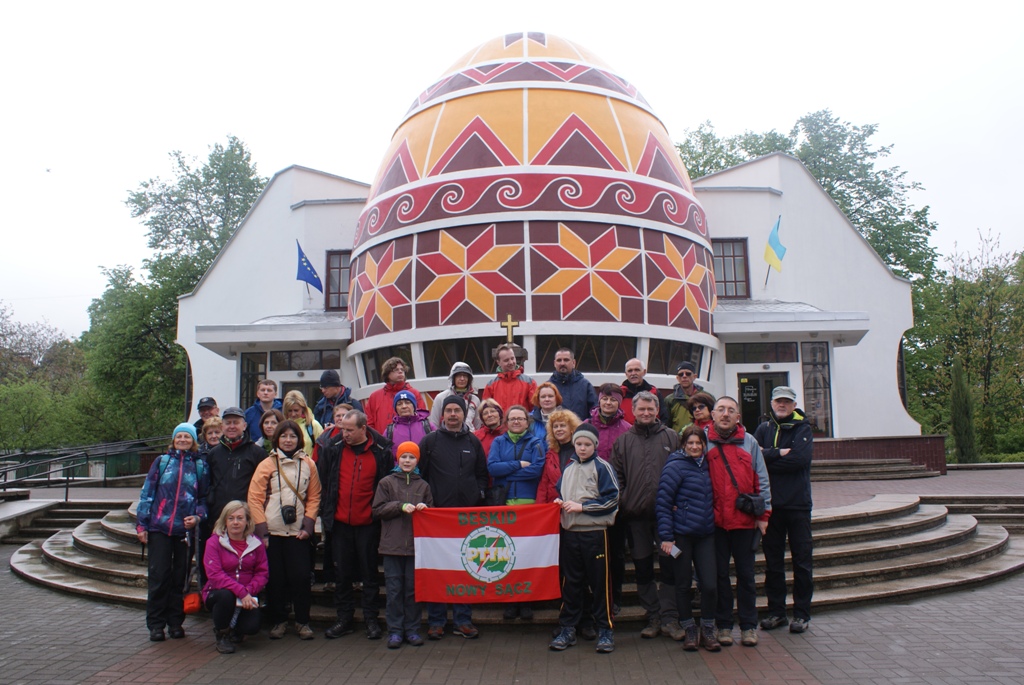 Kolejnego dnia pogoda niezbyt sprzyjała górskim wędrówkom dlatego naszym celem stała się Kołomyja. W budynku, jakżeby inaczej, o kształcie wielkiego jajka, znajduje się muzeum pisanek. Okazało się, że jest tu również Polonia. Działają, mimo trudnych warunków, polska szkoła sobotnia, do zwiedzenia której zostaliśmy przypadkowo zaproszeni, oraz dziecięcy zespół folklorystyczny. Na zakończenie zobaczyliśmy zabytkową drewnianą cerkiew wpisaną na Listę Światowego Dziedzictwa Kultury UNESCO. Po powrocie do Jaremcza turyści udali się na krótki spacer po Skałach Dobosza (Ołeksa Dowbusz albo też Dobosz był to taki ukraiński Janosik ukrywający się w górach, jaskiniach i uroczyskach karpackich, który stał się postacią prawie legendarną). Był to krótki trening przed zaplanowanym na poniedziałek wejściem na najwyższą górę Beskidów Pokuckich – Rotyło (1483 m.).