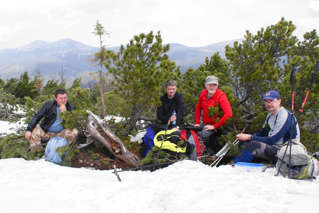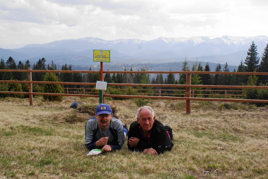 W miarę mozolnego zdobywania wysokości pogoda poprawiała się, a z częściowo zaśnieżonego szczytu roztaczał się piękny widok na białe szczyty Czarnohory i spowijające doliny morze mgieł. Na podszczytowej polanie zachwycały licznie kwitnące szafrany ( jest to lokalna odmiana różniąca się nieco od naszych krokusów)