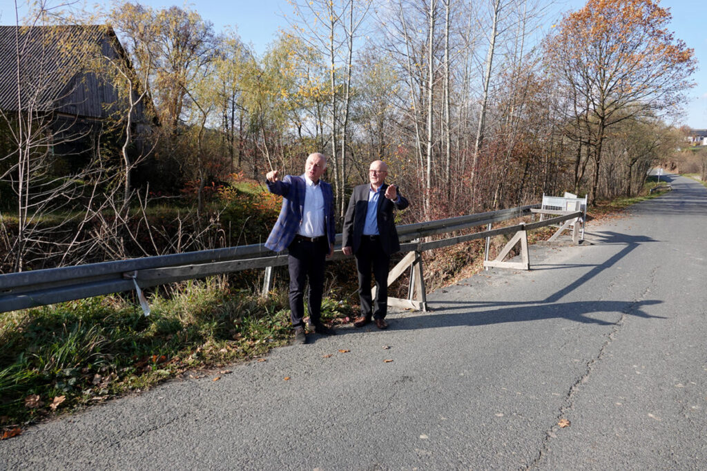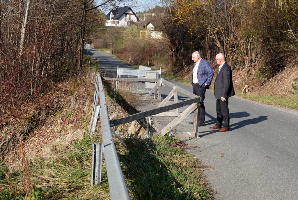 Starosta nowosądecki Marek Kwiatkowski sprawdzał stan przejezdności drogi powiatowej w Koniuszowej. Na dwóch przepustach są tam duże wyrwy powstałe w wyniku powodzi w lipcu 2021 r.