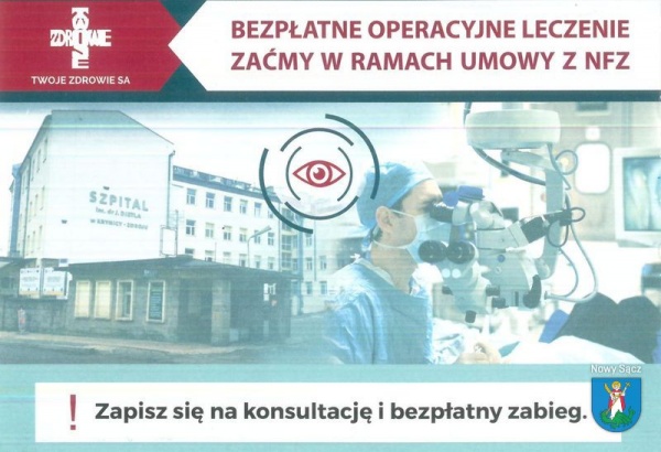 Informujemy, że istnieje możliwość bezpłatnego wykonania operacji zaćmy. Czas oczekiwania na wykonanie zabiegu wynosi około jednego do dwóch miesięcy. Bliższe informacje na temat możliwości bezpłatnego operacyjnego leczenia zaćmy można uzyskać w Wydziale Ochrony Zdrowia i Opieki Społecznej Urzędu Miasta Nowego Sącza, nr tel. 18 448 67 82 i 18 448 67 80.