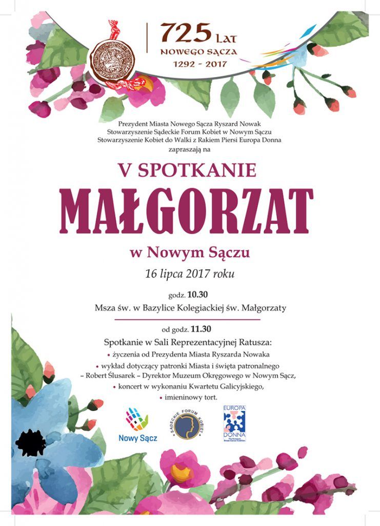 Już po raz piąty w Nowym Sączu spotkają się posiadaczki pięknego imienia Małgorzata (16 lipca, niedziela). Małgosie, Gośki i Gosiaczki zostały zaproszone przez prezydenta miasta Ryszarda Nowaka i sądeckie organizacje Forum Kobiet i Europa Donna. Święta Małgorzata jest patronką Nowego Sącza.