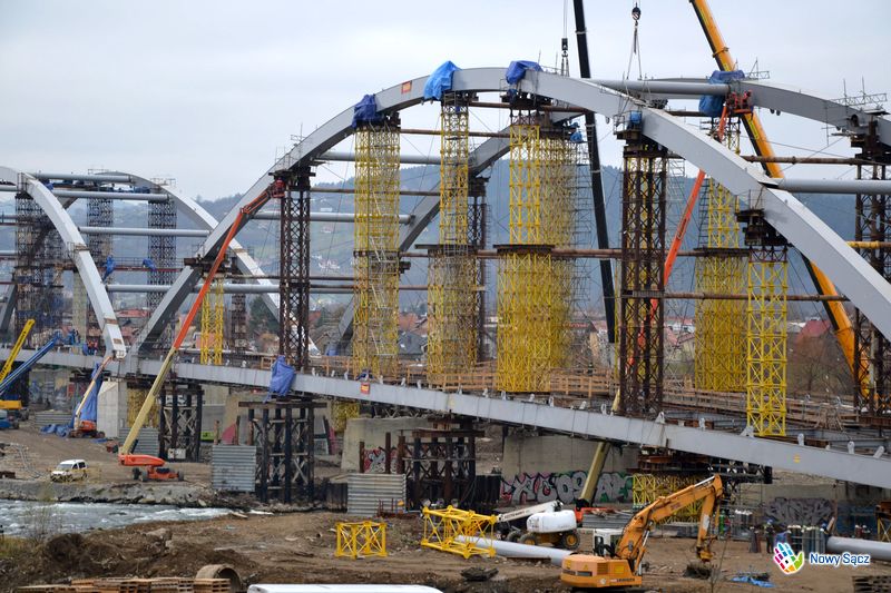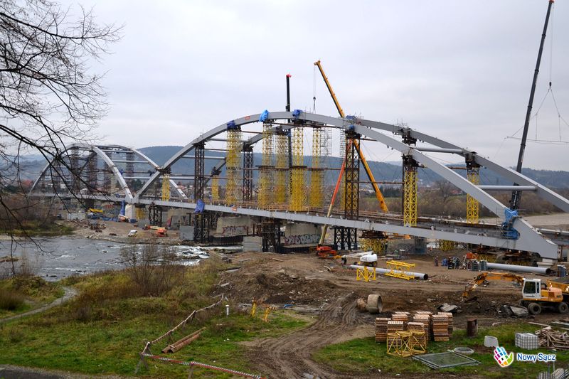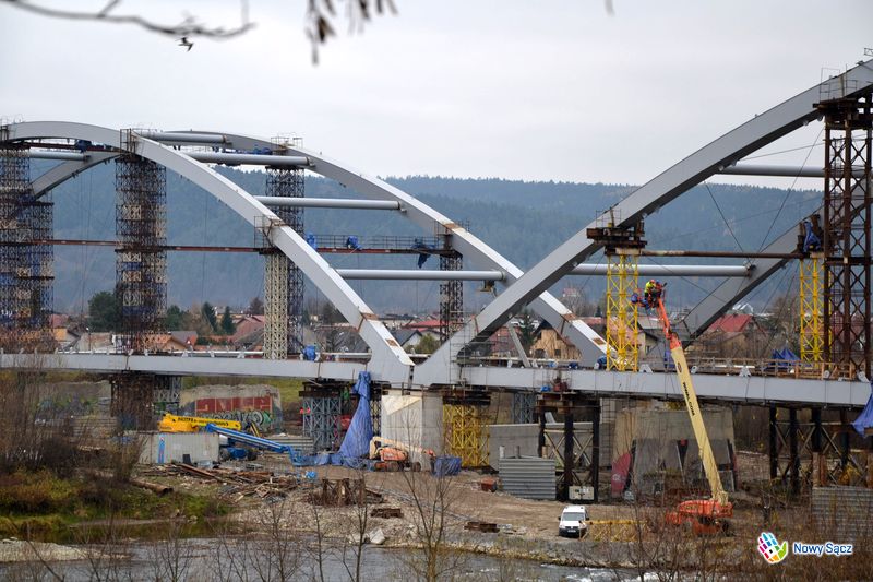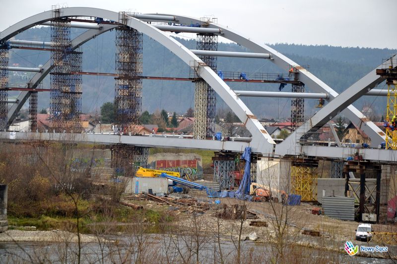 – Od strony dzielnicy Helena montaż łuków jest ukończony i trwają prace związane z demontażem podpór tymczasowych pod łukami. Po wykonaniu wstępnego sprężenia obiektu i przystąpieniu do montażu odciągów, czyli lin, zostanie rozpoczęty montaż deskowania płyty pomostu oraz zbrojenia i jej betonowania. Podobna sytuacja będzie występować od strony zamku, po zakończeniu montażu łuków – mówi dyrektor Miejskiego Zarządu Dróg w Nowym Sączu Grzegorz Mirek i dodaje:- Od strony dzielnicy Helena prowadzone są prace przy budowie ronda. Ponadto na ukończeniu są nasypy do mostu, wykonywanie murków oporowych. Obecnie układane są krawężniki, wykonywana stabilizacja oraz podbudowy. Po ich zakończeniu przystąpimy do wykonywania warstw bitumicznych na całym odcinku od ulicy Krakowskiej, poprzez rondo, aż do obiektu mostowego. Ponadto w najbliższych dniach będą prowadzone prace związane z zakończeniem nasypów do mostu od strony zamku oraz dokończone zostanie układanie warstw bitumicznych do mostu.