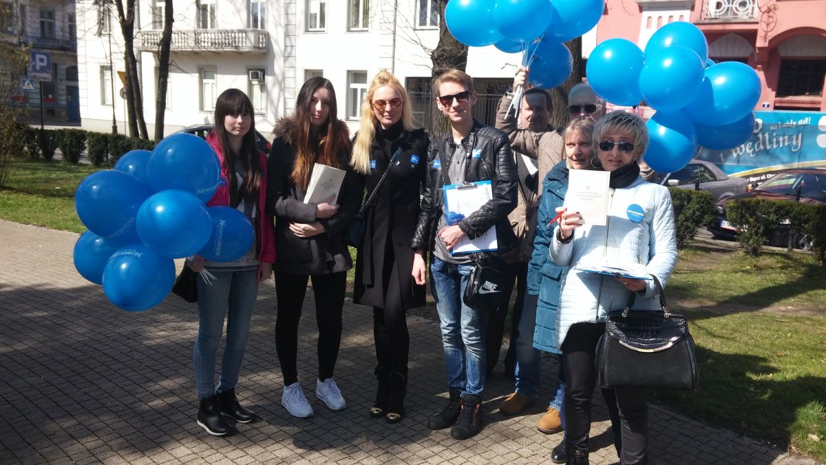 Niebieskie baloniki i egzemplarze Konstytucji od Nowoczesnej