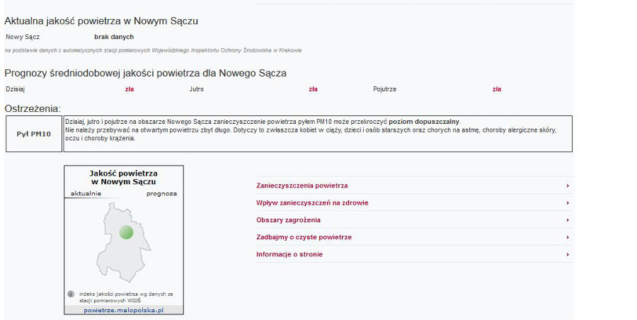 Druga inicjatywa, to planowane porozumienie z Politechniką Warszawską i Akademią Morską w Gdyni. Jej celem będzie stworzenie systemu opomiarowania jakości powietrza na terenie Nowego Sącza, opartego o kilka urządzeń monitorujących, zlokalizowanych w różnych częściach miasta. Dzięki Temu możliwe będzie rzeczywiste określenie problemu ochrony powietrza, a potem podjęcie dalszych działań interwencyjnych. Miasto w ten sposób chce uniknąć częstych rozbieżności między danymi prognozowanymi, a rzeczywistymi pomiarami z urządzenia znajdującego się przy ulicy Nadbrzeżnej (przykład rozbieżnych prognoz podawanych oddzielnie dla miasta i województwa znajduje się w grafikach poniżej).
