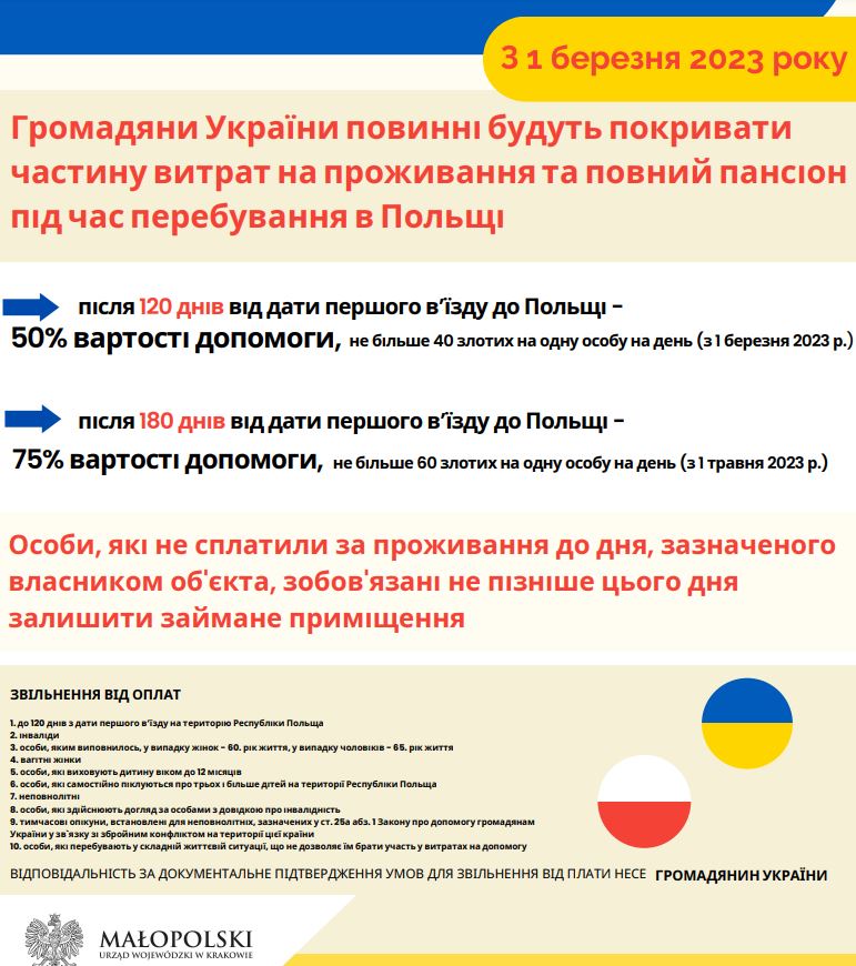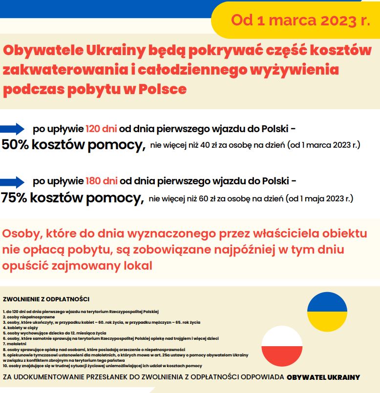Od 1 marca 2023 roku obywatele Ukrainy będą pokrywać część kosztów zakwaterowania i całodziennego wyżywienia podczas pobytu w Polsce.