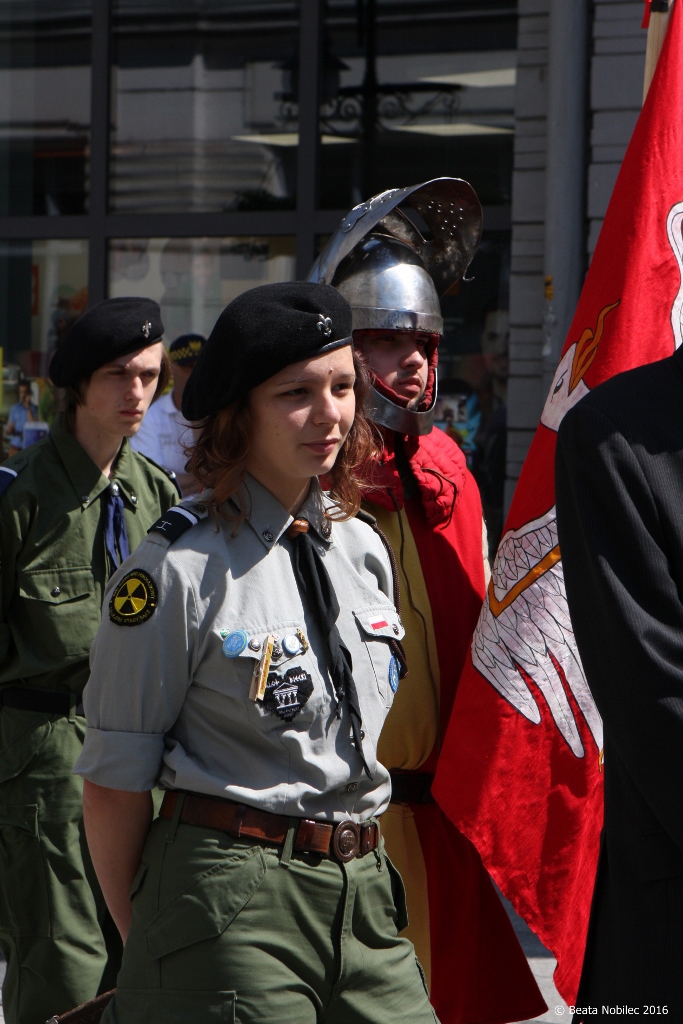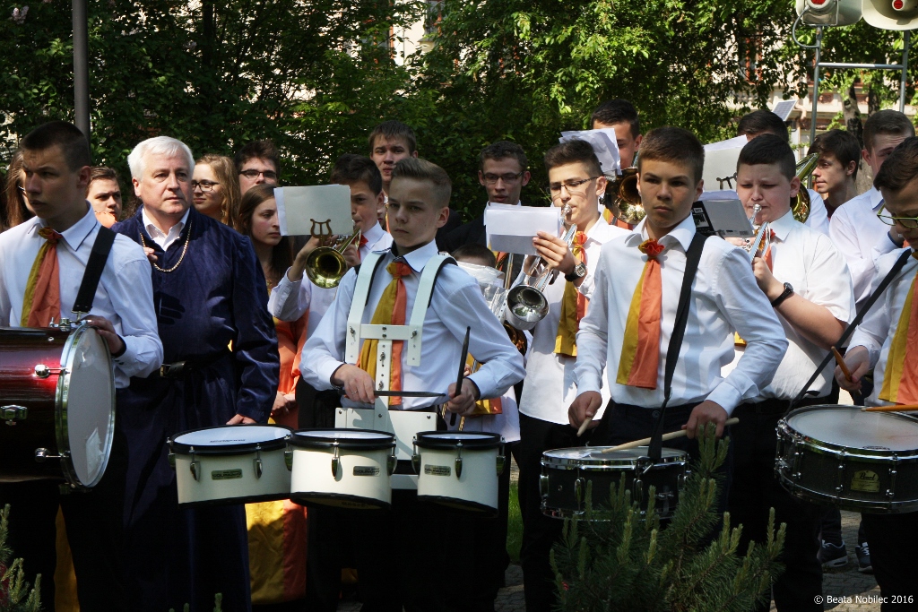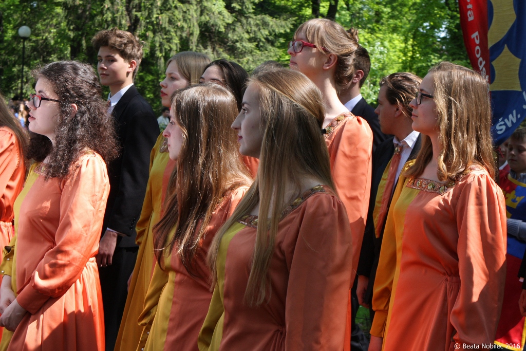 Uroczystość rozpoczęła się odsłonięciem tablicy patronackiej ku czci patrona szkoły. Zostało nim Muzeum Bitwy pod Grunwaldem w Stębarku. Potem orszak w strojach z czasów Jagiellonów przeszedł pod Dąb Wolności na Plantach, gdzie uczeń w rycerskim stroju otrzymał z rąk króla Kazimierza Jagiellończyka królewski sztandar. Jan Długosz (w tej roli Michał Zacłona) pod Dębem Wolności  przypomniał, że Polska świętuje 1050 lat chrztu. – Nic nie dane jest nam raz na zawsze. Na nas spoczywa rola strażników. Z tamtej pięknej, minionej rzeczywistości powinniśmy ocalić te najcenniejsze skarby i ponieść w dzień jutrzejszy – tłumaczy uczony.