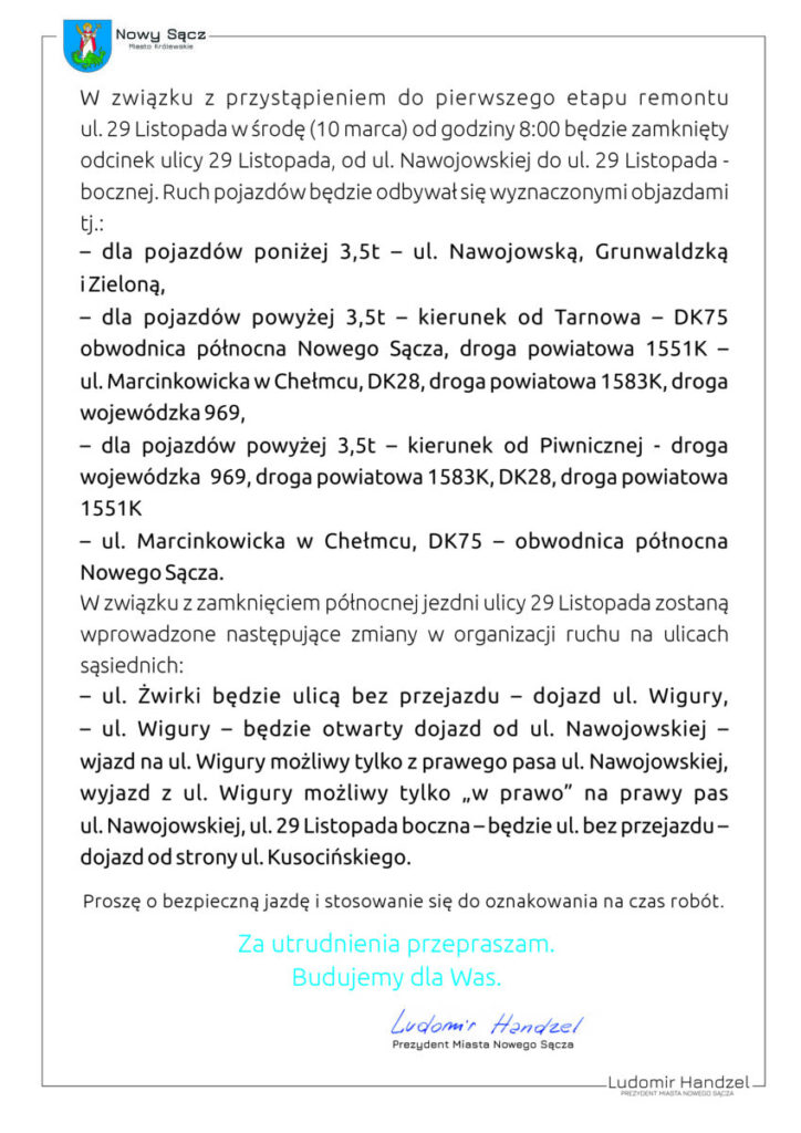 Remont ul. 29 Listopada – utrudnienia w ruchu