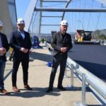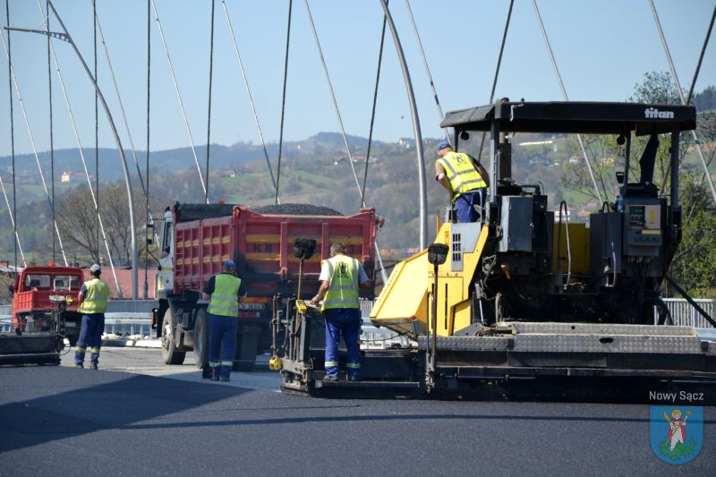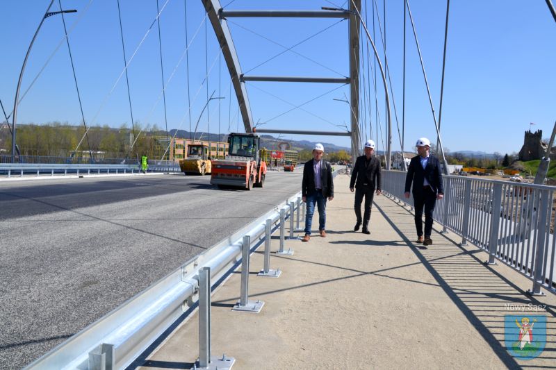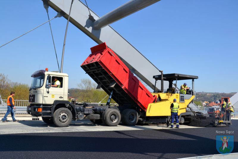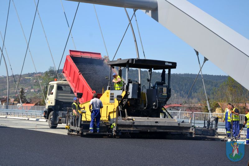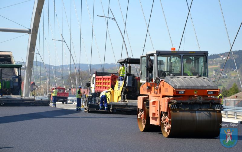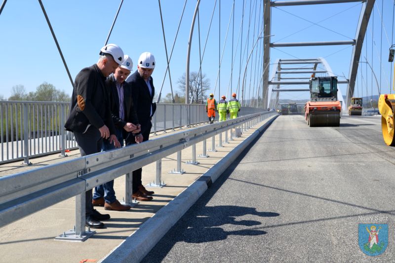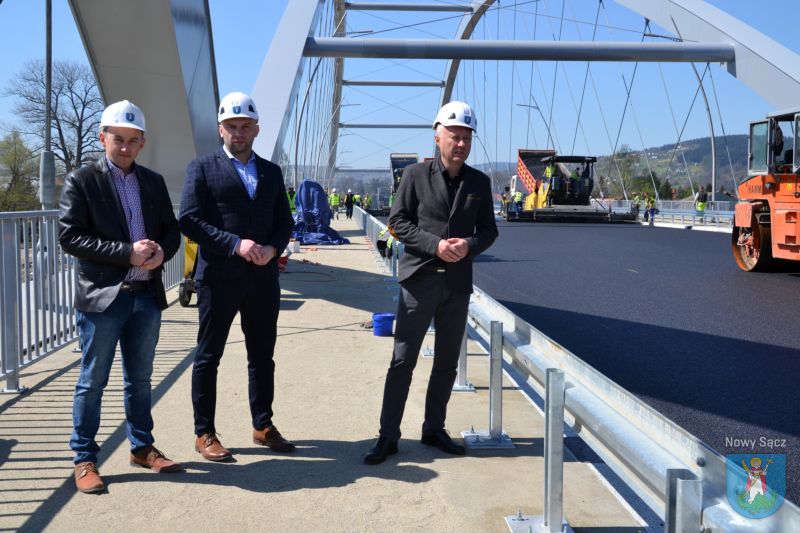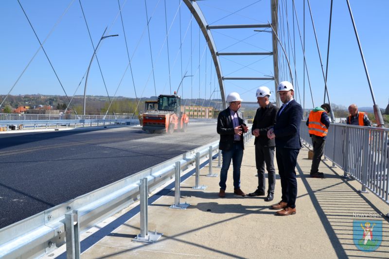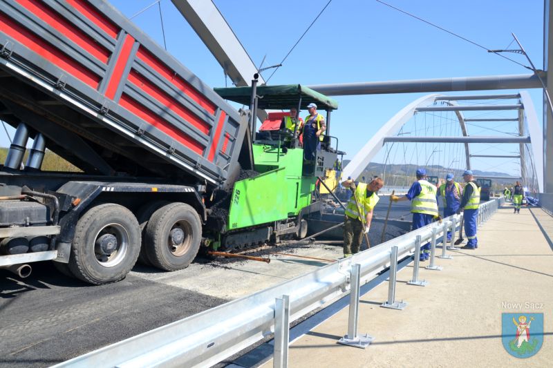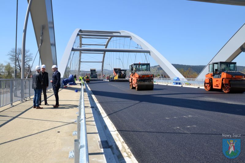 Prace na moście heleńskim obserwowali Prezydent Miasta Nowego Sącza Ludomir Handzel oraz jego zastępca Artur Bochenek. Pogoda dopisuje, więc robotnicy mogą bez przeszkód kłaść ostatnią warstwę asfaltu.
