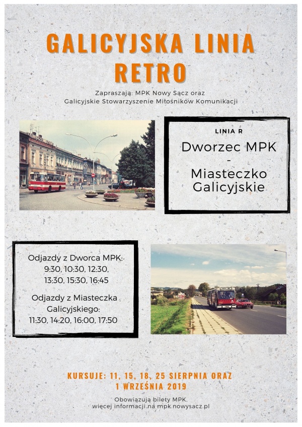 Linia muzealna „R” relacji Dworzec MPK – Miasteczko Galicyjskie będzie kursować w niedziele: 11, 15, 18, 25 sierpnia oraz 1 września. Uruchomiona zostanie przez Galicyjskie Stowarzyszenie Miłośników Komunikacji we współpracy z MPK Nowy Sącz. Kursy wykonywane będą przez zabytkowy autobus Autosan H9-35 #94 z 1978r. Na podróż zabytkowym autobusem zaprasza prezydent Ludomir Handzel.
