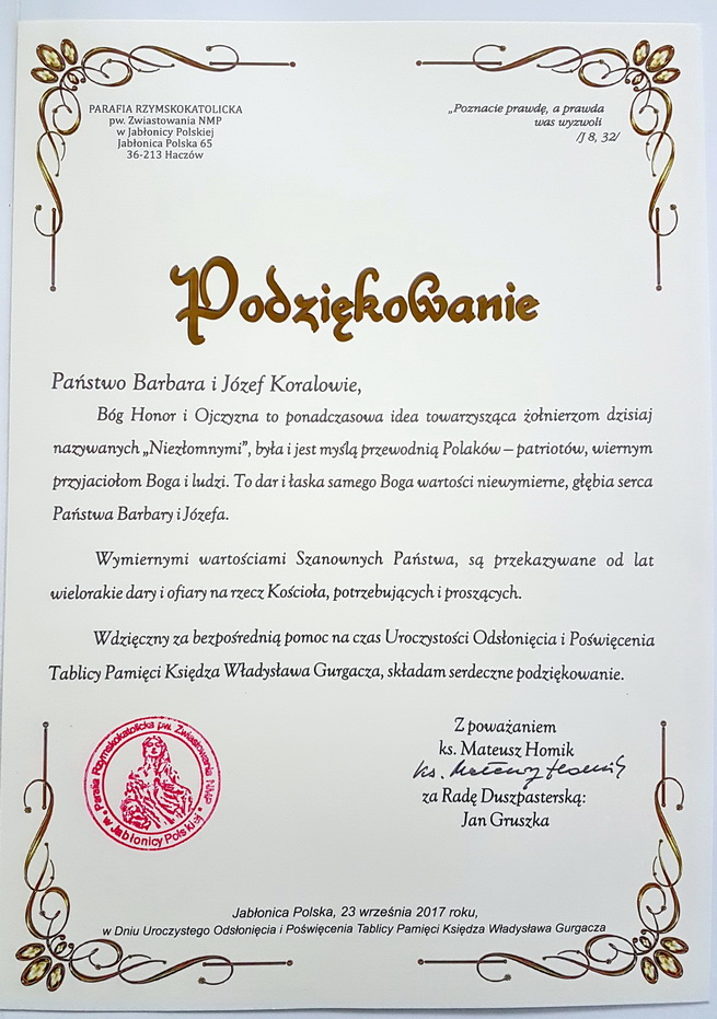 W sobotę 23 września duża grupa Sądeczan wyruszyła do Jabłonicy Polskiej – miejsca urodzenia jezuity na uroczystość odsłonięcia pamiątkowej tablicy poświęconej kapelanowi „Żandarmerii”. Patronat nad nią objął prezydent RP Andrzej Duda.