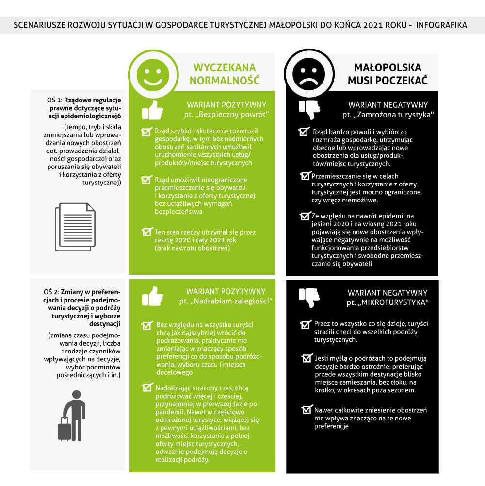 Te dwa czynniki stanowią tak zwane osie, z których każda ma po dwa skrajne warianty: pozytywny i negatywny, a ich dowolne połączenie dają cztery realne i odmienne scenariusze. Najbardziej pozytywny dla branży turystycznej, nazwany „Wyczekana normalność”, zakłada optymalne i stosowne do sytuacji działania rządu w walce z epidemią oraz zachowania konsumenckie zbliżone do takich jakie przejawili turyści zanim świat opanowała pandemia. Scenariusz negatywny, zwany „Małopolska musi poczekać”, jest całkowitym przeciwieństwem pierwszego. Zakłada, że regulacje prawne i tempo ich wprowadzania nie odpowiadają potrzebom chwili, a pożądane zachowania konsumenckie obserwowane przed erą koronawirusa w dużym stopniu zanikły.