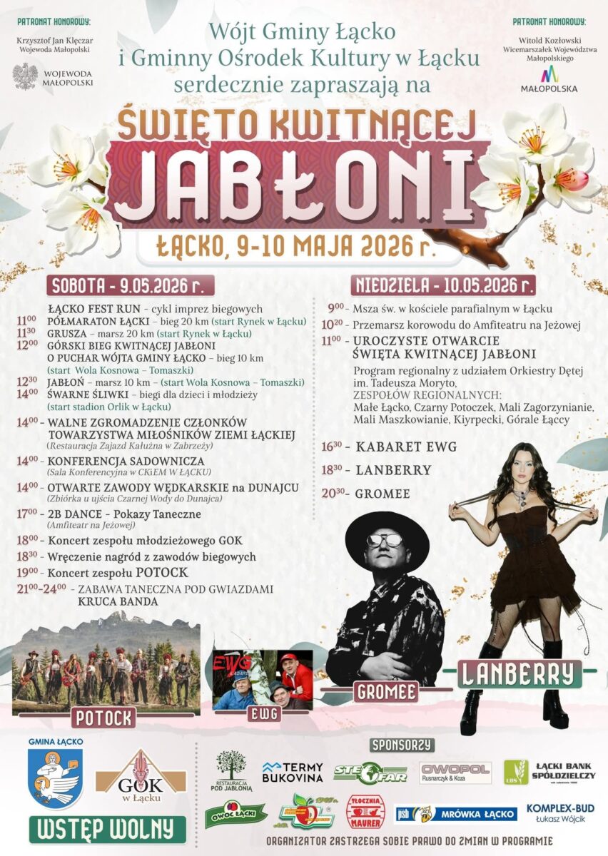 W dniach 9–10 maja 2026 roku Łącko ponownie stanie się sercem regionu, celebrując jedno z najpiękniejszych wydarzeń w Małopolsce – Święto Kwitnącej Jabłoni. Tegoroczna edycja zapowiada się wyjątkowo intensywnie: od sportowych emocji, przez wydarzenia kulturalne, aż po koncerty znanych artystów, takich jak Lanberry i Gromee.