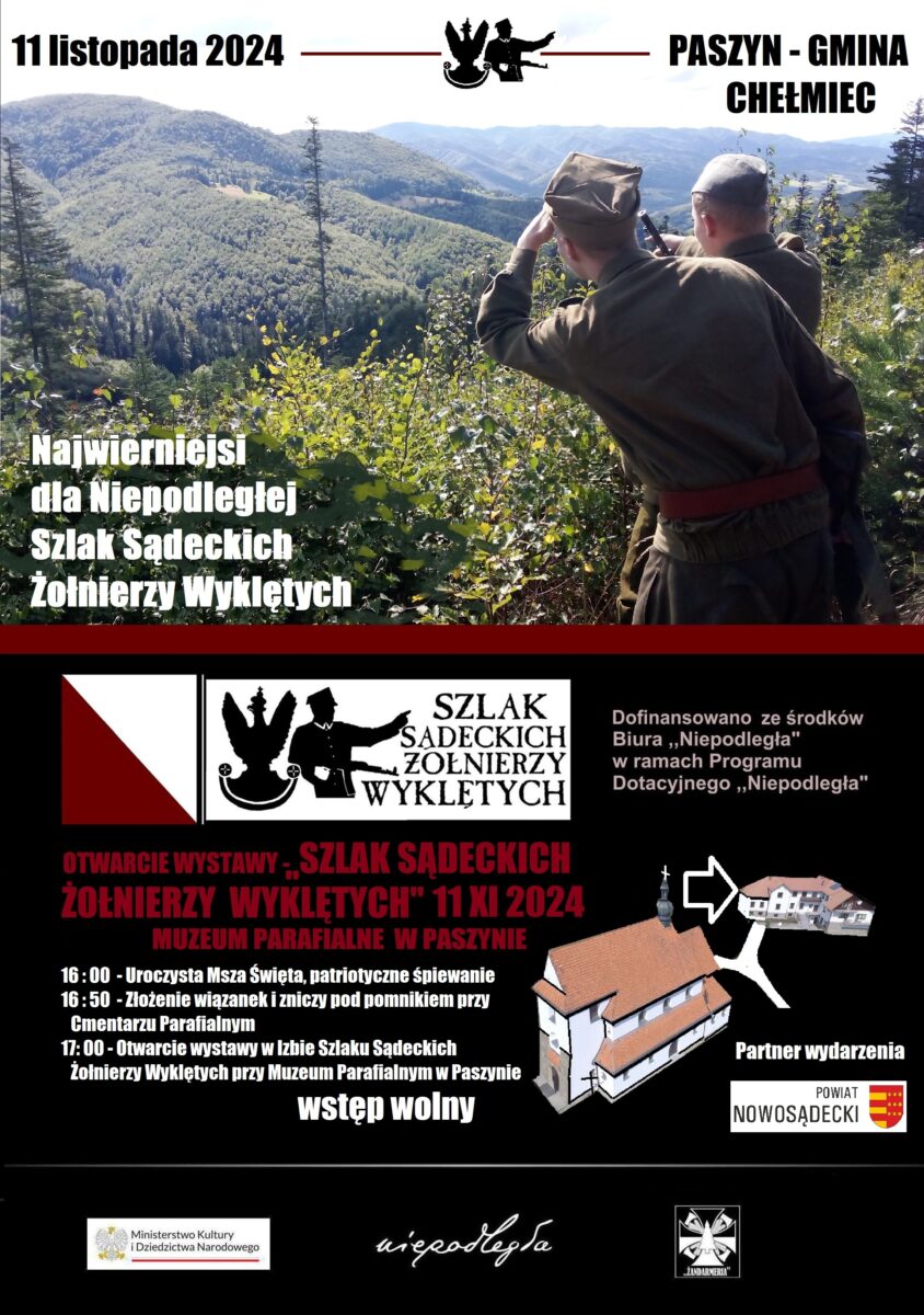 Zapraszamy serdecznie do zwiedzania wystawy pn. „Najwierniejsi dla Niepodległej. Szlak Sądeckich Żołnierzy Wyklętych”, która będzie prezentowana w Muzeum Parafialnym (prywatne Muzeum Sztuki Ludowej) w Paszynie. Uroczyste otwarcie wystawy odbędzie się w dn. 11 listopada o godz. 16.00.