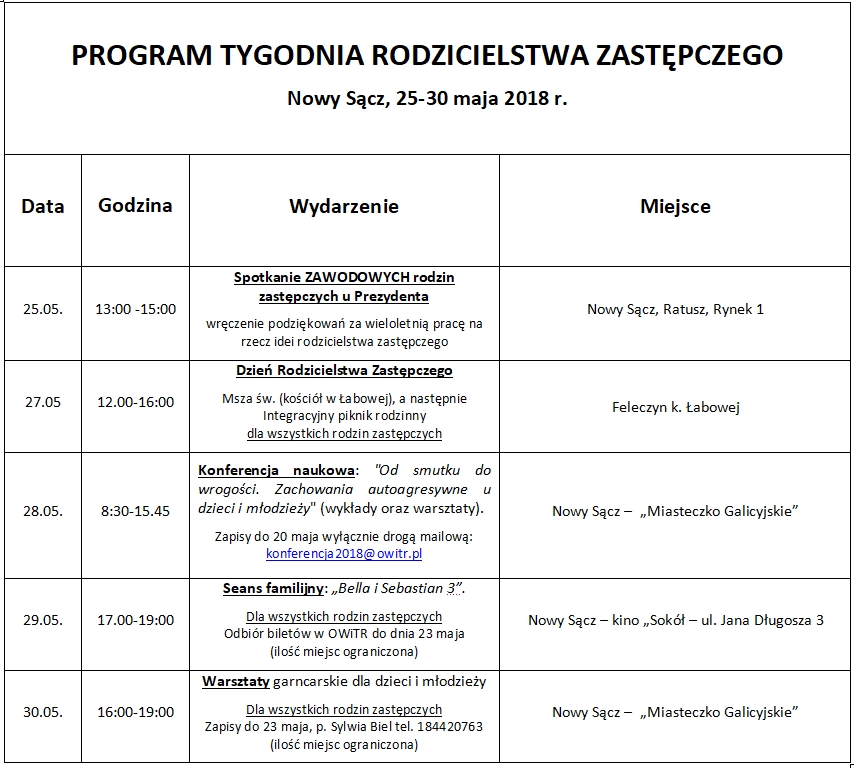 Jak co roku w ramach Tygodnia Rodzicielstwa Zastępczego została zorganizowana konferencja naukowa pt. „OD SMUTKU DO WROGOŚCI. Zachowania autoagresywne u dzieci i młodzieży”. Konferencja odbędzie się w dniu 28 maja 2018 r. w Miasteczku Galicyjskim i kierowana jest głównie do zawodowych rodzin zastępczych z terenu miasta Nowego Sącza, specjalistów, pracowników instytucji pomocowych oraz szkół. Patronat honorowy nad konferencją objął Prezydent Miasta Nowego Sącza, pan Ryszard Nowak.