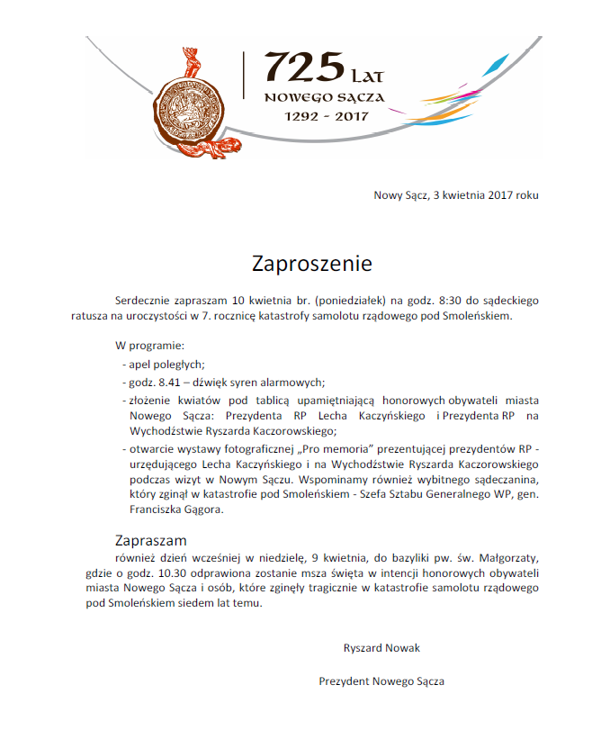 Prezydent Ryszard Nowak zaprasza również dzień wcześniej (niedziela, 9 kwietnia) do bazyliki pw. św. Małgorzaty, gdzie o godz. 10:30 odprawiona zostanie msza święta w intencji honorowych obywateli miasta Nowego Sącza i osób, które zginęły tragicznie w katastrofie samolotu rządowego pod Smoleńskiem siedem lat temu.