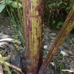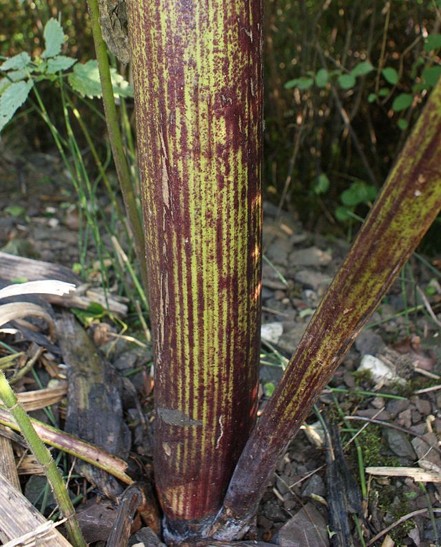 Barszcz Sosnowskiego posiada długą, bruzdowatą łodygę o wysokości od 1 do nawet 4 metrów. Łodyga jest wewnątrz pusta. Roślina jest u góry zielona, ku dołowi pokryta purpurowymi plamkami. Barszcz Sosnowskiego posiada duże liście o średnicy do 150 cm.