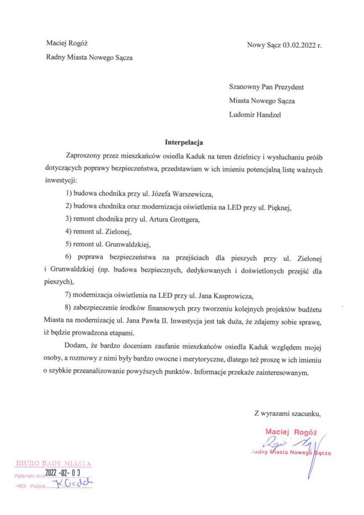 Radny razem z mieszkańcami wizytowali kilka ulic Kaduka, a listę najważniejszych inwestycji radny Maciej Rogóż przedstawił w interpelacji skierowanej do Władz Miasta. Poniżej lista: