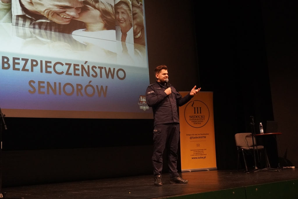 W ramach cyklicznych spotkań profilaktyczno-edukacyjnych z sądeckimi seniorami realizowanych przez funkcjonariuszy Komendy Miejskiej Policji w Nowym Sączu, mł. asp. Radosław Koział z Zespołu ds. Prewencji Kryminalnej, Nieletnich i Patologii Wydziału Prewencji spotkał się ze słuchaczami Sądeckiego Uniwersytetu Trzeciego Wieku.