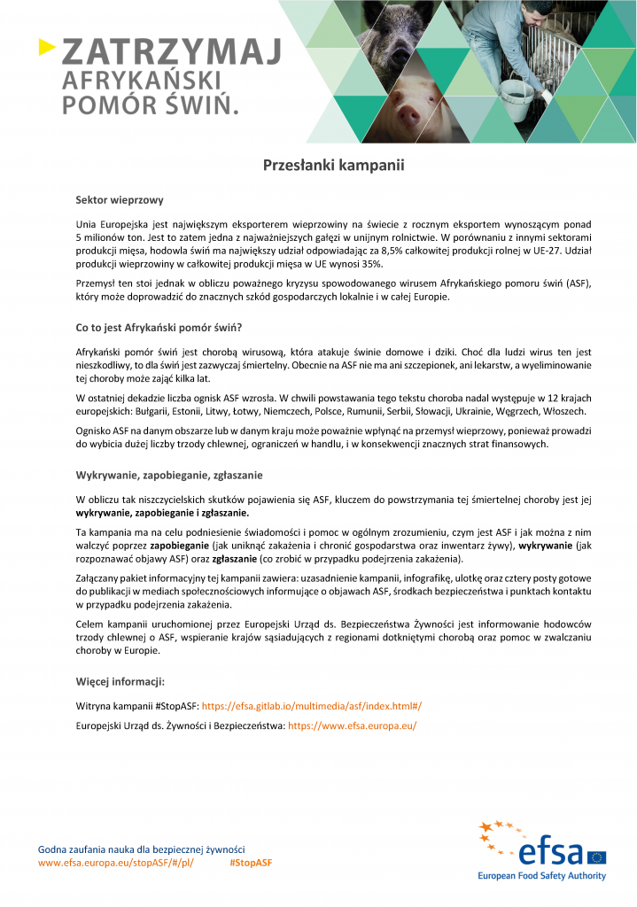 Powiatowy Lekarz Weterynarii w Nowym Sączu przesyła materiały Europejskiego Urzędu ds. Bezpieczeństwa Żywności (EFSA) z kampanii STOP ASF. Afrykański pomór świń (ASF) to śmiertelna choroba dotykająca świnie domowe i dziki, na którą nie ma szczepionki ani lekarstwa. ASF nie jest groźny dla ludzi, może natomiast poważnie zaszkodzić hodowli świń. Wybuchy ognisk ASF stanowią poważne zagrożenie dla hodowli świń. Wykrywanie, zapobieganie i zgłaszanie ASF, może powstrzymać jego rozprzestrzenianie się i chronić świnie.