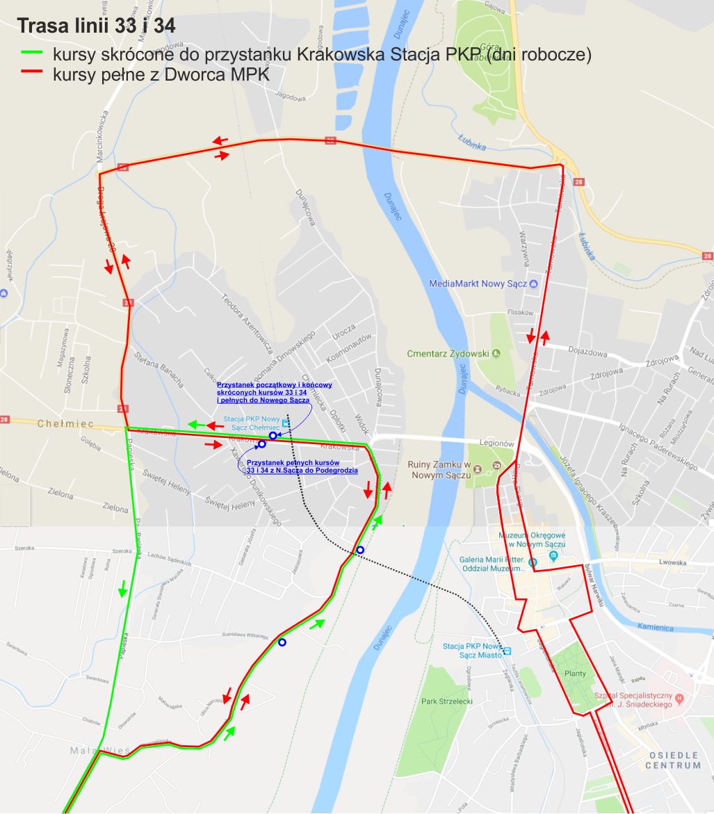 3. Kursy z Mokrej Wsi, Podegrodzia do Nowego Sącza: ….Starowiejska, Krakowską, Marcinkowicka, Obwodnica Północna i dalej własną trasą. Linia pomija przejazd ul. Dunajcową i Jagodową.