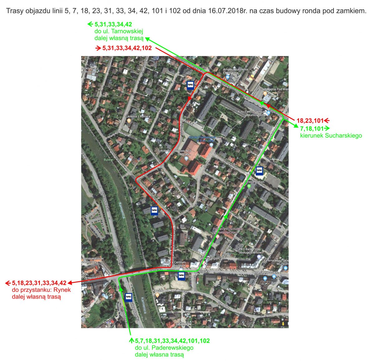 W związku z zamknięciem skrzyżowania pod sądeckim zamkiem od dnia 16 lipca 2018 roku (na czas budowy ronda) Miejskie Przedsiębiorstwo Komunikacyjne Sp. z o.o. w Nowym Sączu wprowadza zmiany w trasach przejazdu linii aktualnie przejeżdżających przez przedmiotowe skrzyżowanie.