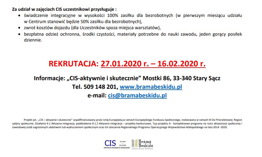 Stowarzyszenie Lokalna Grupa Działania „Brama Beskidu” oraz partnerzy: Spółdzielnia Socjalna Serwis oraz Powiatowy Urząd Pracy dla powiatu nowosądeckiego, realizujący projekt pn. „CIS – aktywnie i skutecznie” serdecznie zapraszają do udziału w projekcie: