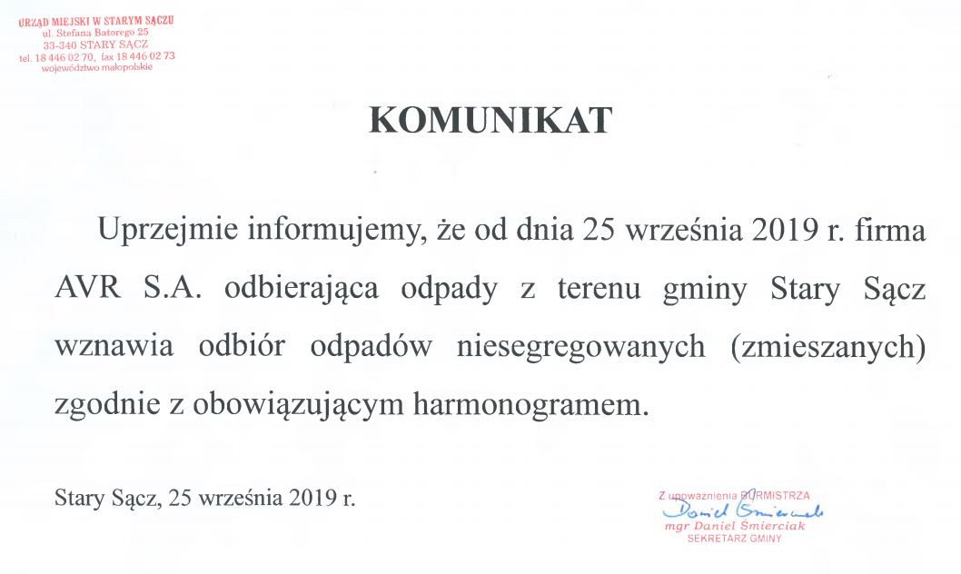 Z dniem dzisiejszym (25 września) firma AVR wznawia wywóz odpadów mieszanych z terenu Miasta i Gminy Stary Sącz. Wywóz odbywać się będzie zgodnie z dotychczasowym harmonogramem.
