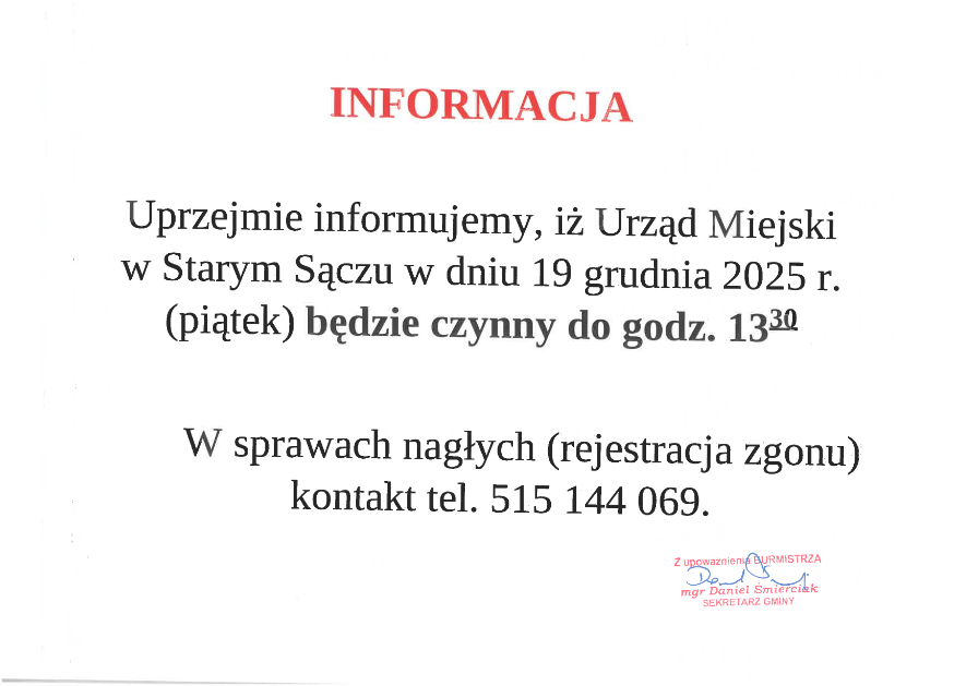 Informacja o godzinach pracy Urzędu Miejskiego – 19 grudnia 2025 r.