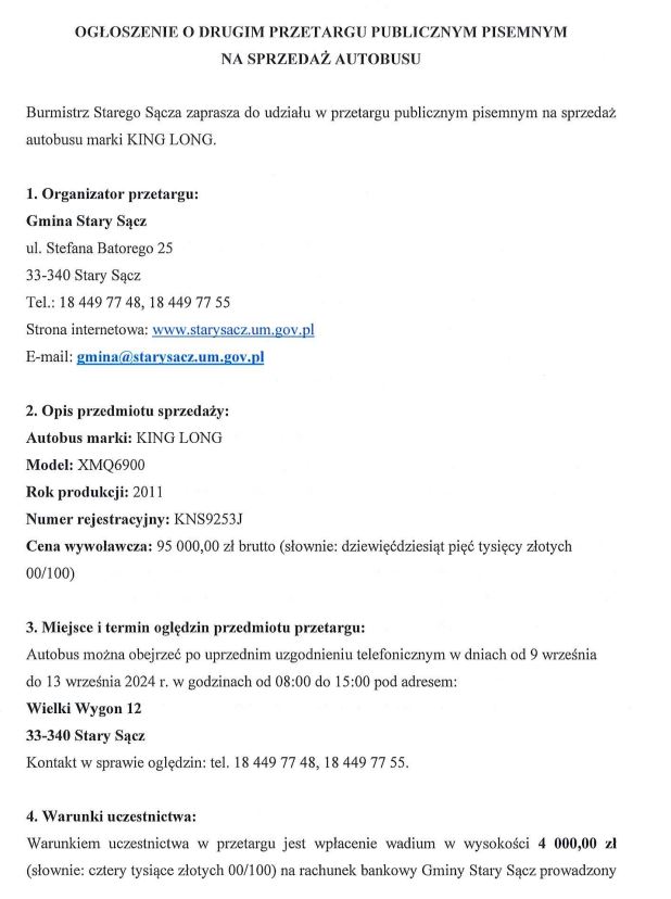 Ogłoszenie o drugim przetargu publicznym pisemnym na sprzedaż autobusu