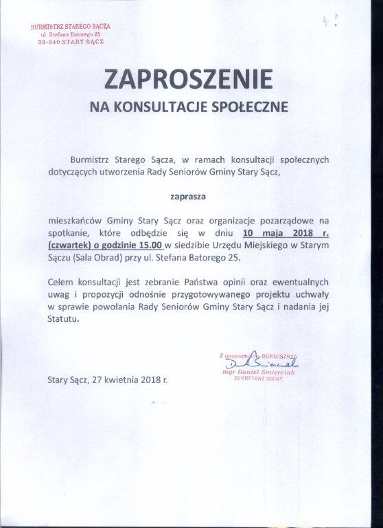Burmistrz Starego Sącza zaprasza na spotkanie w ramach konsultacji społecznych: 10 maja 2018 r. g. 15.00, sala obrad UM w Starym Sączu. Opinie i uwagi można przesyłać również w tradycyjny sposób.