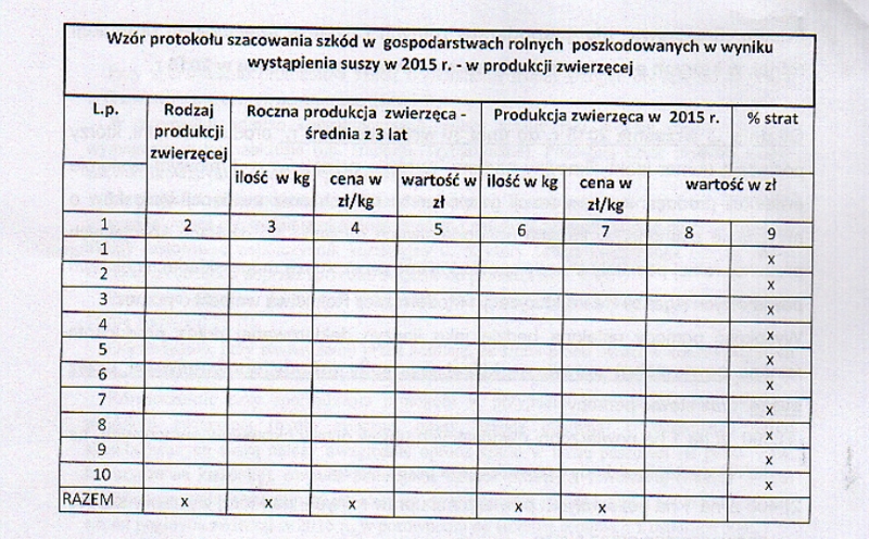 Równocześnie przy sporządzaniu protokołu w przypadku prowadzenia przez rolnika produkcji zwierzęcej (bydło mleczne, opasy, trzoda chlewna) i wystąpienia szkód spowodowanych suszą należy uwzględnić oprócz szkód w bazie paszowej (II pokos traw, kukurydza na kiszonkę) również potencjalny spadek produkcji zwierzęcej (mleka, żywca) spowodowany niedoborem pasz jak również ograniczeniem jej produkcji z powodu sprzedaży części pogłowia zwierząt w 2015 roku w porównaniu do średniej produkcji z ostatnich 3 lat.